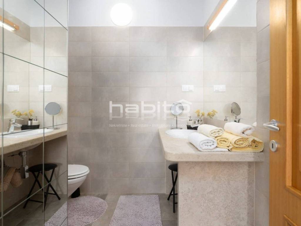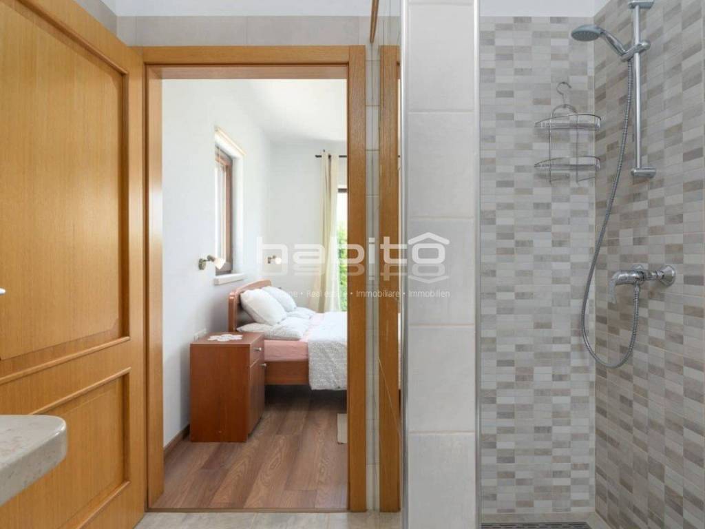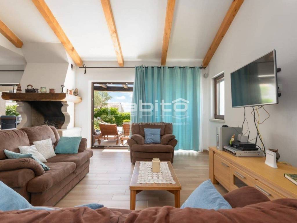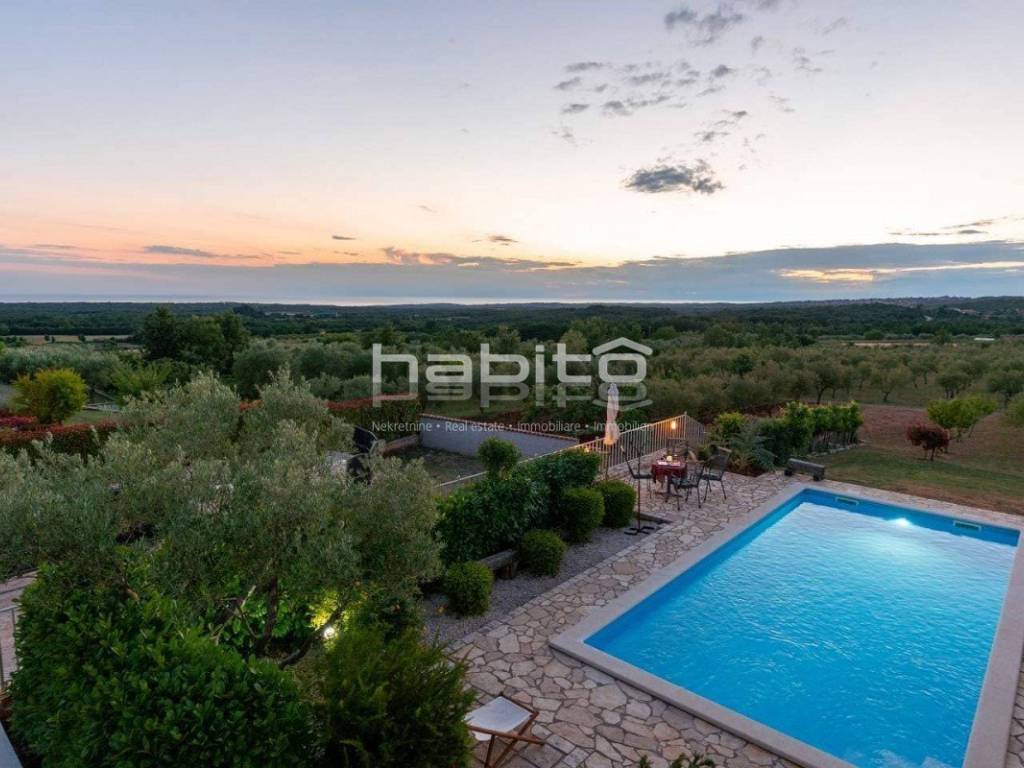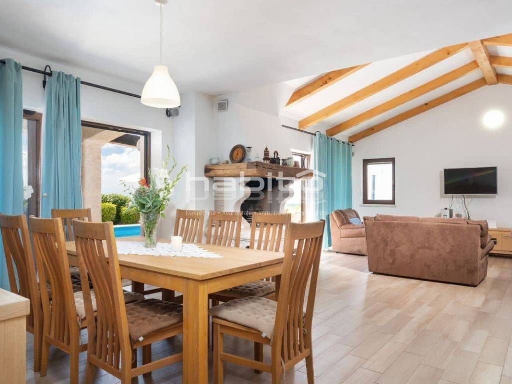 The house of approx. 160 m on two floors consists of a ground floor where you will find a kitchen with a dining room and a spacious living room with a fireplace and two exits to a covered terrace, one bedroom with with its own bathroom, a separate toilet. On the first floor of the house there are two bedrooms with its own bathroom. Both rooms have a beautiful panoramic sea view and the view of the village of Visnjan.