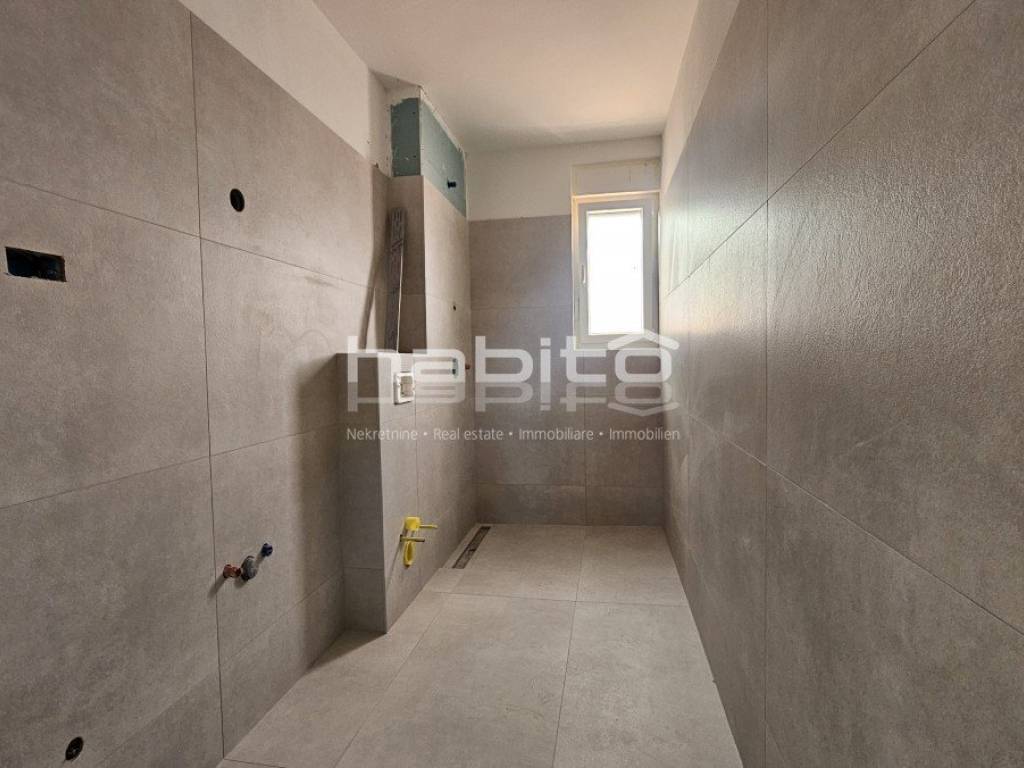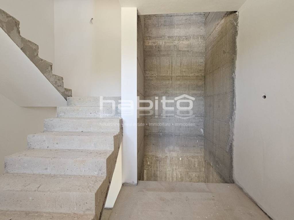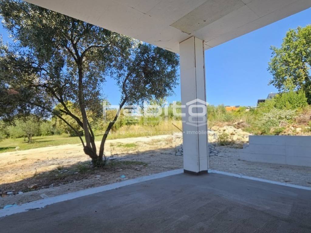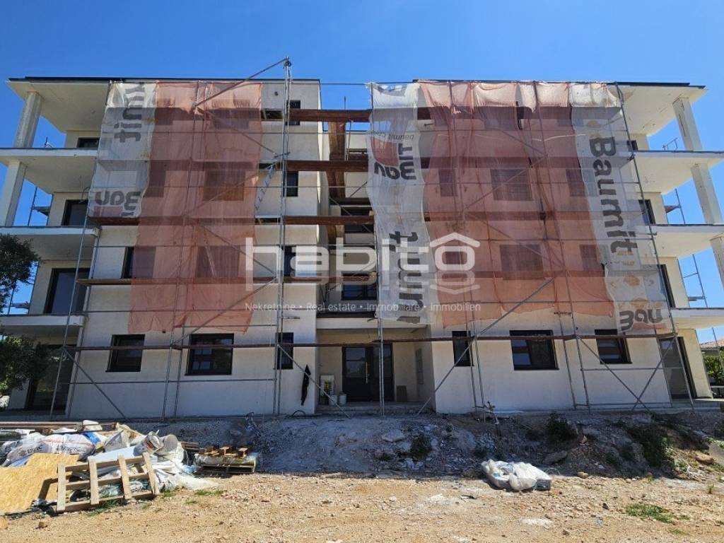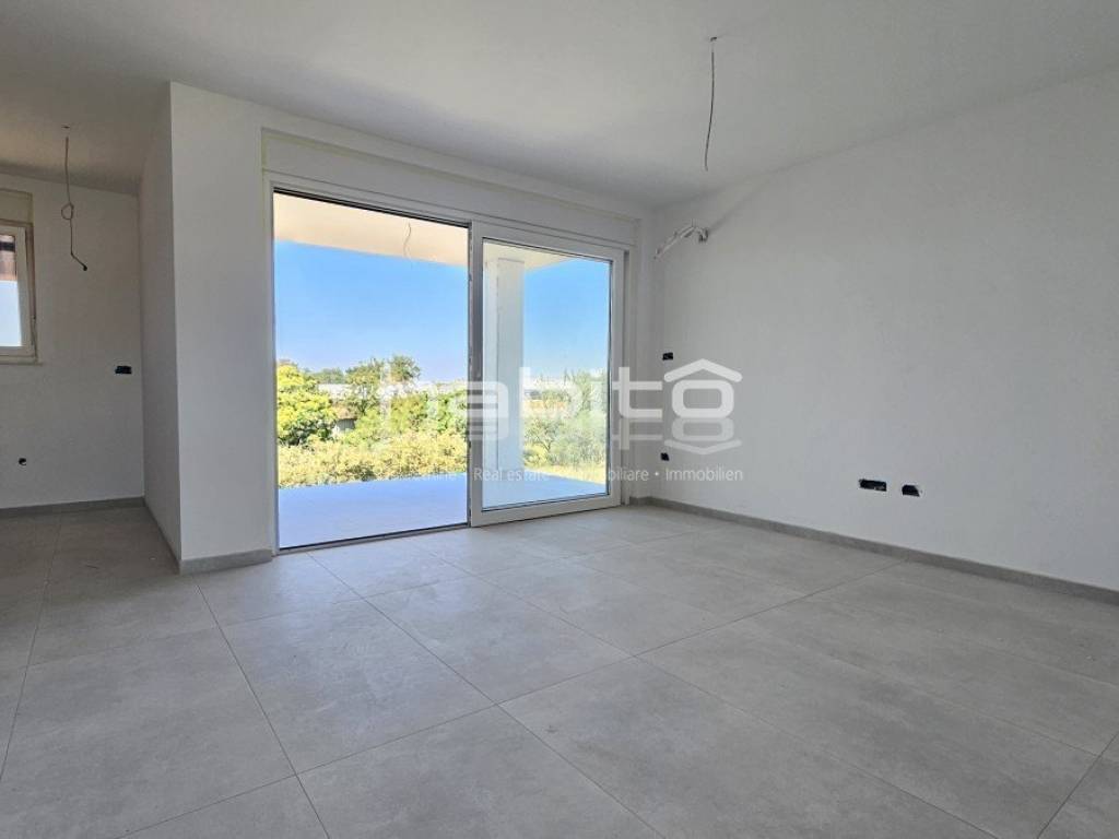 An apartment under construction in the vicinity of Porec is for sale, measuring 67 m2, consisting of a living room, dining room, kitchen, hallway, covered terrace, two bedrooms, bathroom and toilet. The apartment is located on the ground floor in a building with an elevator, has a spacious garden, electric underfloor heating in the living area and bathroom, security doors, air conditioning in the living room and bedrooms, a storage room in the basement of the building measuring 5 m2 and two parking spaces in front of the building. The apartment is approximately 2.5 km from the sea and 9 km from the center of Porec, in the village there are restaurants, cafes, a pharmacy, a school and a supermarket.