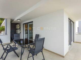 The apartment is located on the 1st floor of a newer building, just a few minutes walk from the beach. It is 71.05 m2 in size, and consists of an entrance hall, an "open space" area with a kitchen, dining room and living room, a utility room, 2 bedrooms and a spacious balcony with a sea view. In addition, the apartment also has a roof terrace with a garden, and 1 outdoor parking space, which gives the total area of ​​the property 100.95 m2.