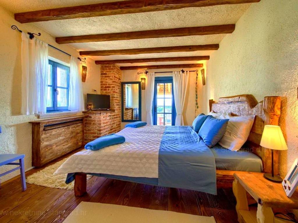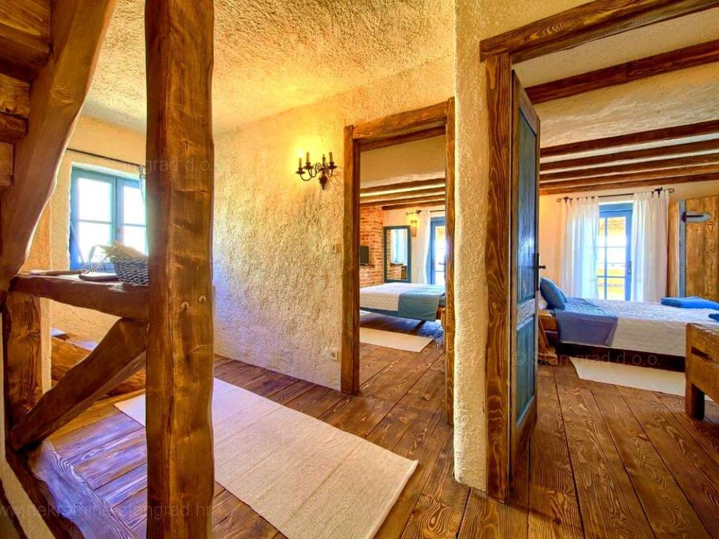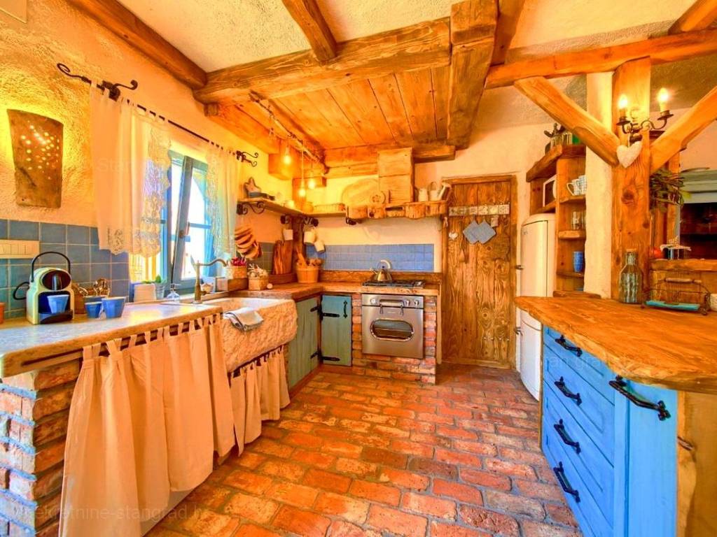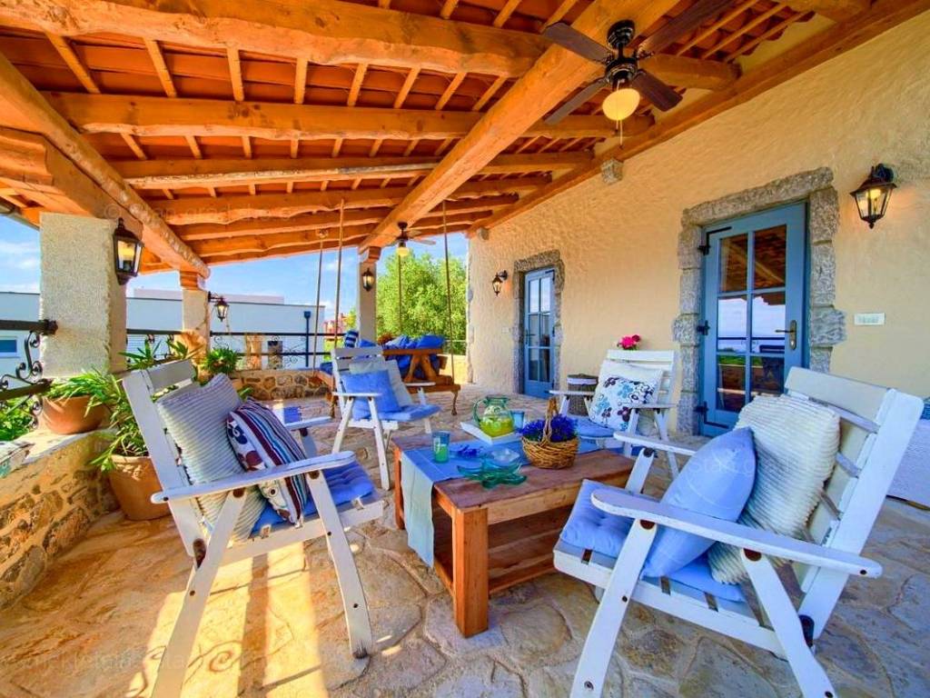 This rustic house spans a total of 4 levels. The structure is designed for family living. The total area of the house is 220 m². This area includes a wine cellar in the basement, a living room with a fireplace, kitchen, and dining room on the ground floor, an outdoor toilet, and a covered loggia. An internal staircase leads to the first floor, which has 2 bedrooms, a bathroom, and a large covered terrace with a sea view. The high attic is a spacious room that can be divided into two bedrooms and a bathroom if needed. The interior of the property is fully equipped with new, high-quality technical devices and uniquely designed furniture. The heating system uses a heat pump, air conditioning system, fan convectors for heating and cooling with regulation for each individual room, high-quality wooden joinery, new installations, and Mediterranean tiles.