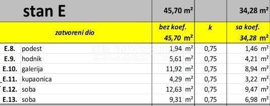 The two-story Apartment E will be located on the second floor and gallery of building A. On the first level, it will consist of a hallway, bathroom, two bedrooms, open-space living room with kitchen and dining area, and a loggia, while on the gallery level, there will be two more bedrooms and a bathroom.
