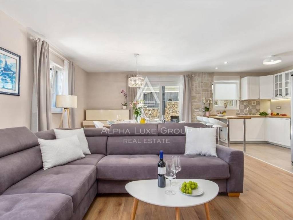The problem of maintaining a suitable temperature in the house can be resolved by installing the underfloor heating system and air conditioners in each room. Additionally, the upper apartment features an indoor fireplace in the living area which adds to the overall ambiance.