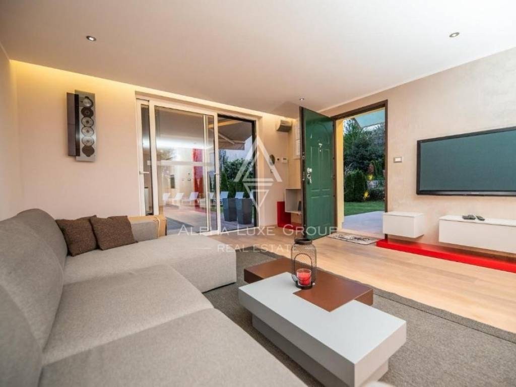 The outdoor area is a true oasis, featuring a lush garden with a captivating covered summer terrace and an outdoor fireplace, perfect for leisure and entertainment. A pristine swimming pool adds to the allure of this haven, surrounded by the natural beauty of Opatija's landscape. The property includes parking space for up to 9 vehicles and benefits from an efficient central pellet heating system and multi-level floor heating, with air-conditioned rooms for year-round comfort.