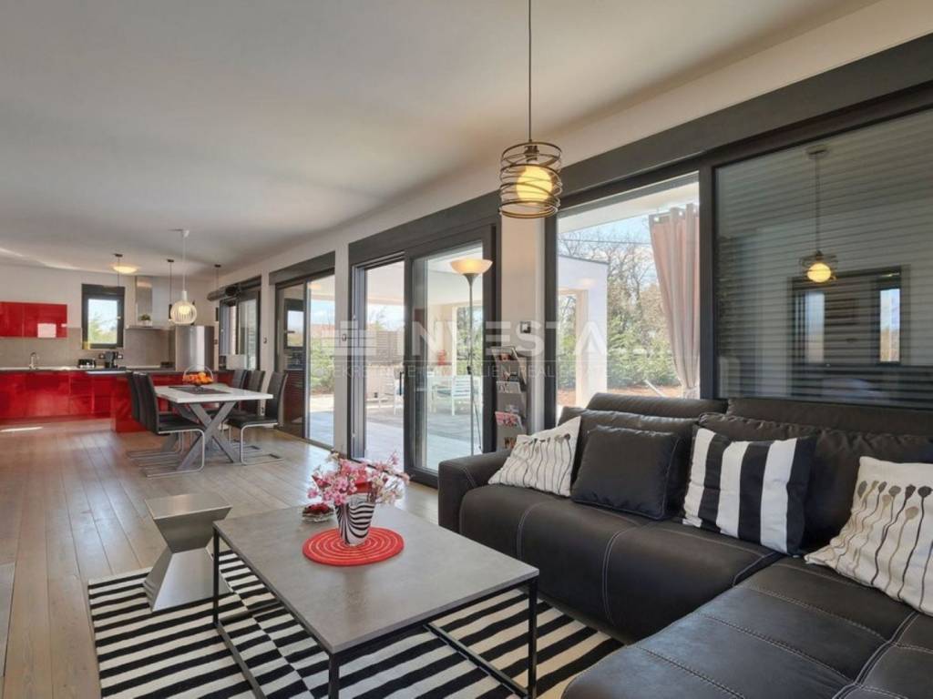 A modern single-story villa of 180 m² is for sale, located in a quiet neighborhood near Vodnjan. This elegant and contemporary villa offers a comfortable and luxurious space for living or vacationing, with a spacious yard and a private pool. In addition to a large indoor kitchen, the house features two additional outdoor kitchens. One is located under a large covered terrace, while the second is a summer kitchen with a barbecue next to an auxiliary building in the garden. The spacious yard, which includes a small children's playground, is enclosed by a tall green fence, ensuring maximum privacy for residents.