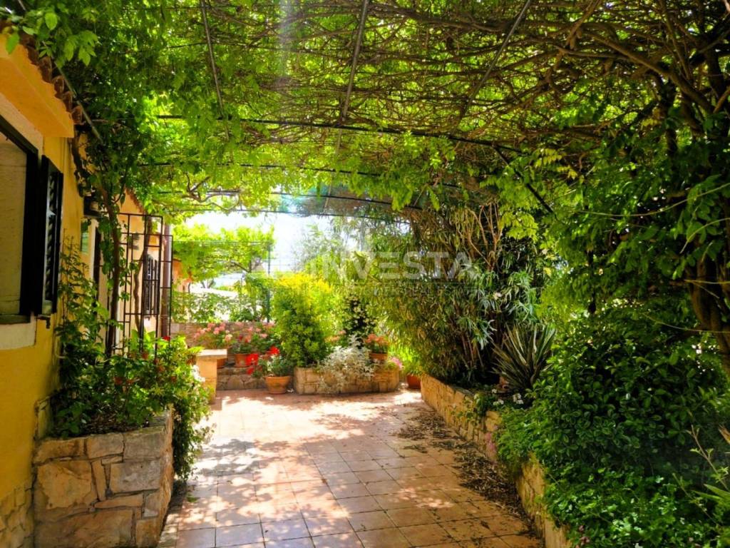 In front of the house is a beautiful garden filled with various plants and flowers, a traditional stone table with a bench, a barbecue with a stone sink, and an area that can serve as parking.