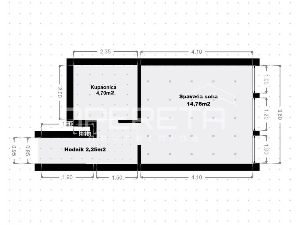 Ulazni hodnik vodi vas u mirnu spavaću sobu te u funkcionalnu kuhinju s blagovaonicom, idealnu za uživanje u svakodnevnim trenucima.