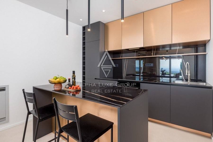 There are three further bedrooms on the ground floor, of which the south-facing bedroom has a terrace with unobstructed views. The villa's ground floor has a spacious living room with large windows opening onto a balcony overlooking the sea. A cozy living room with modern furnishings is perfect for relaxing and spending time with family and friends.