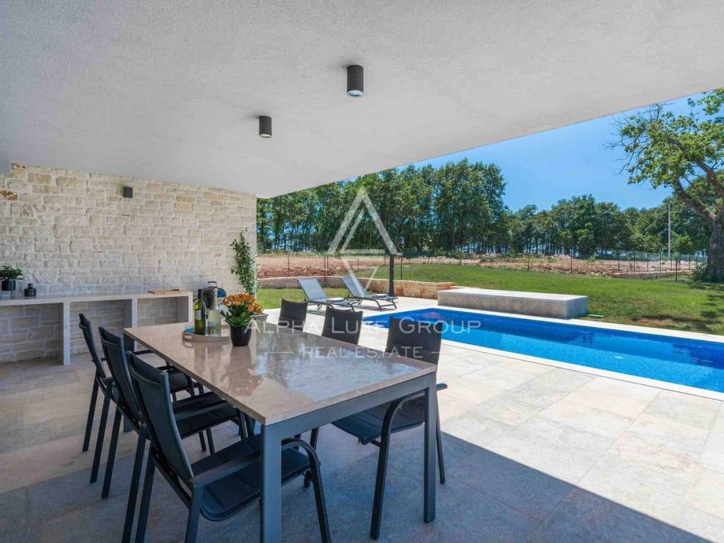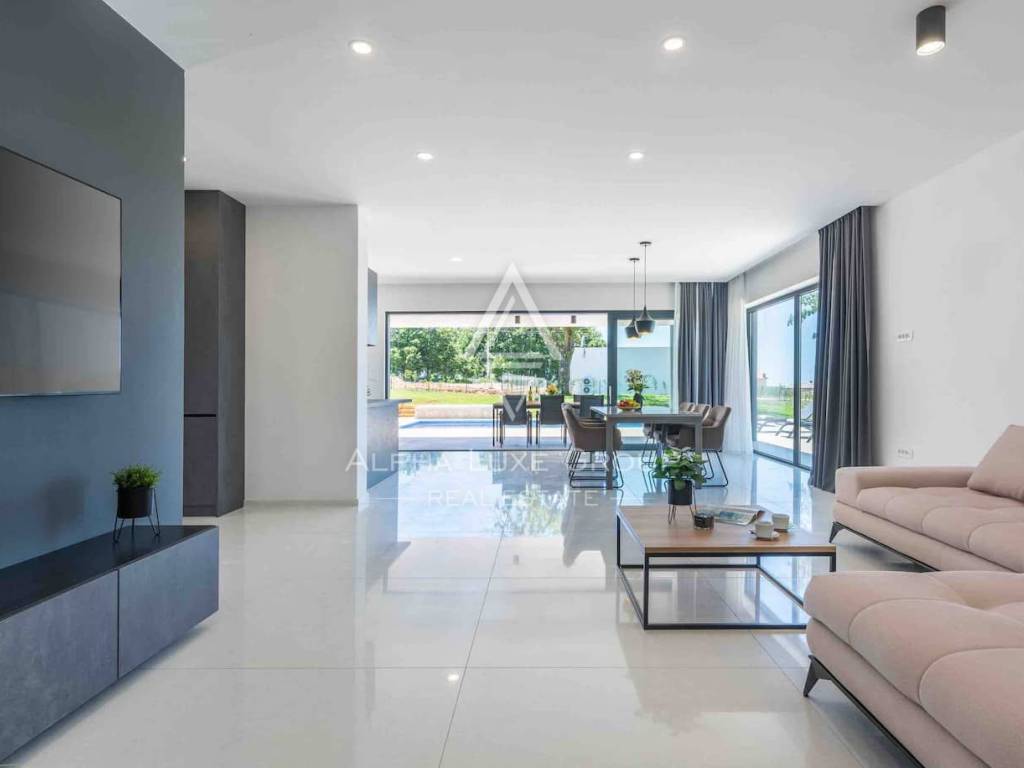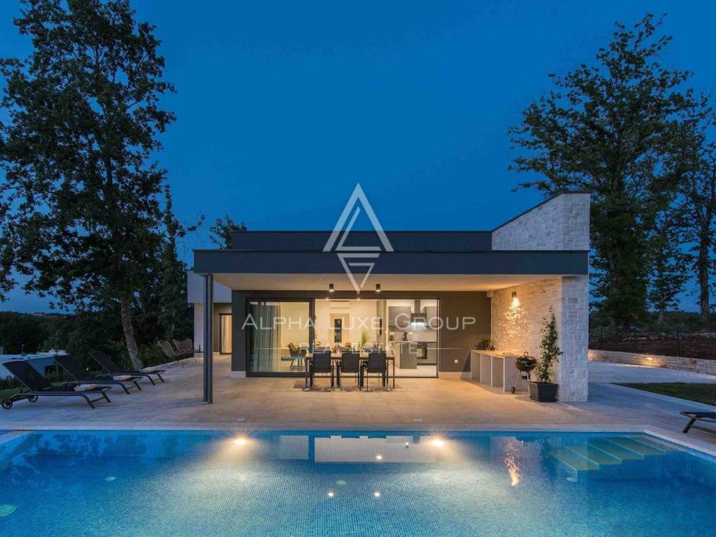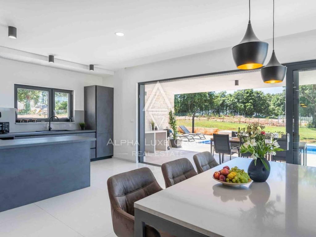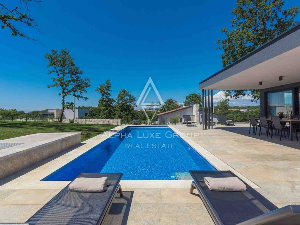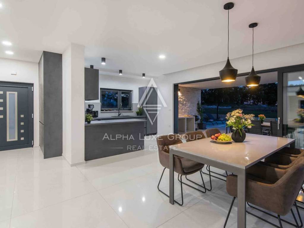 Situated on a generous 1527 m² plot in the peaceful surroundings of Žminj, this modern single storey home offers an exceptional blend of comfort, style and functionality. Designed for effortless everyday living, the property provides 140 m² of interior space featuring a bright open concept layout that connects the living room, kitchen and dining area. Large glass doors open from the living area onto a spacious terrace overlooking the pool and landscaped grounds, creating a seamless indoor outdoor flow.
