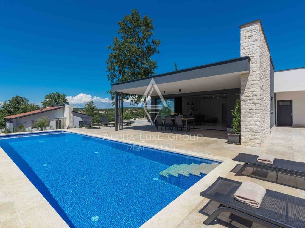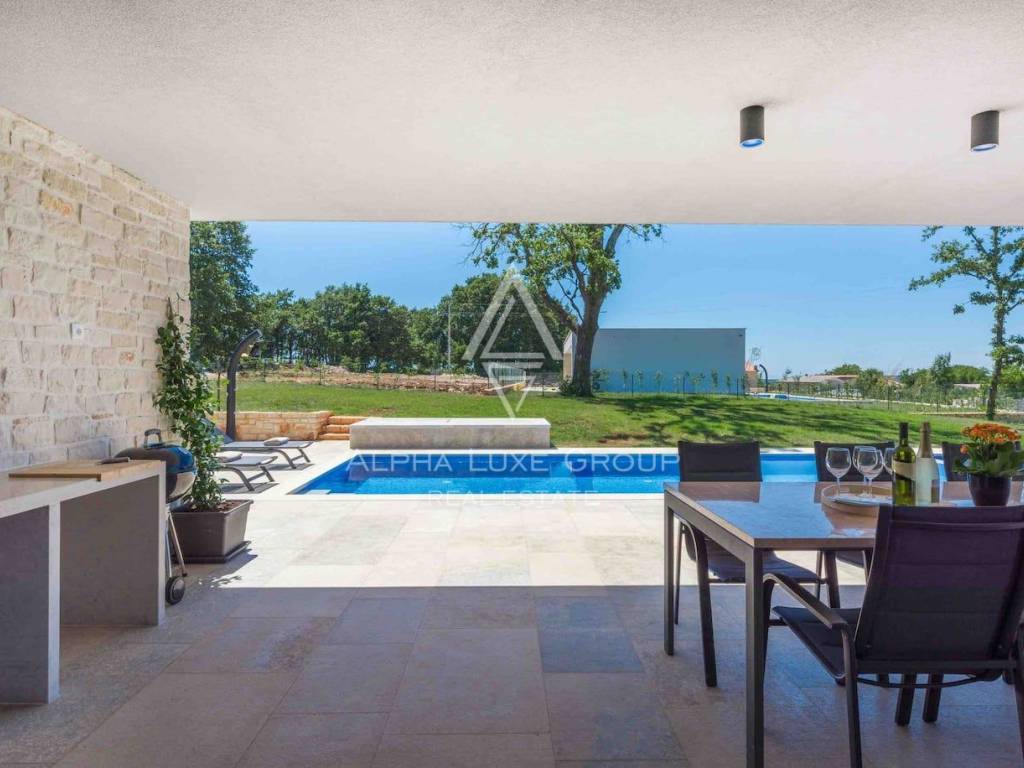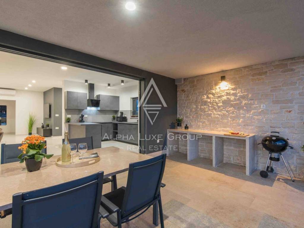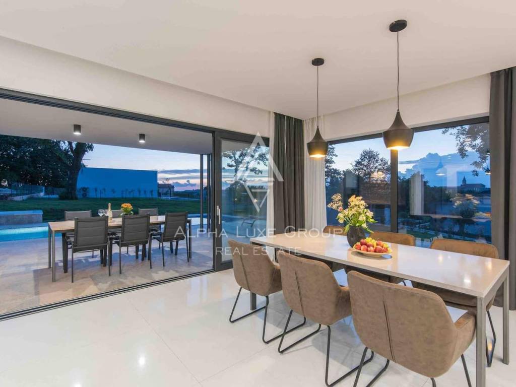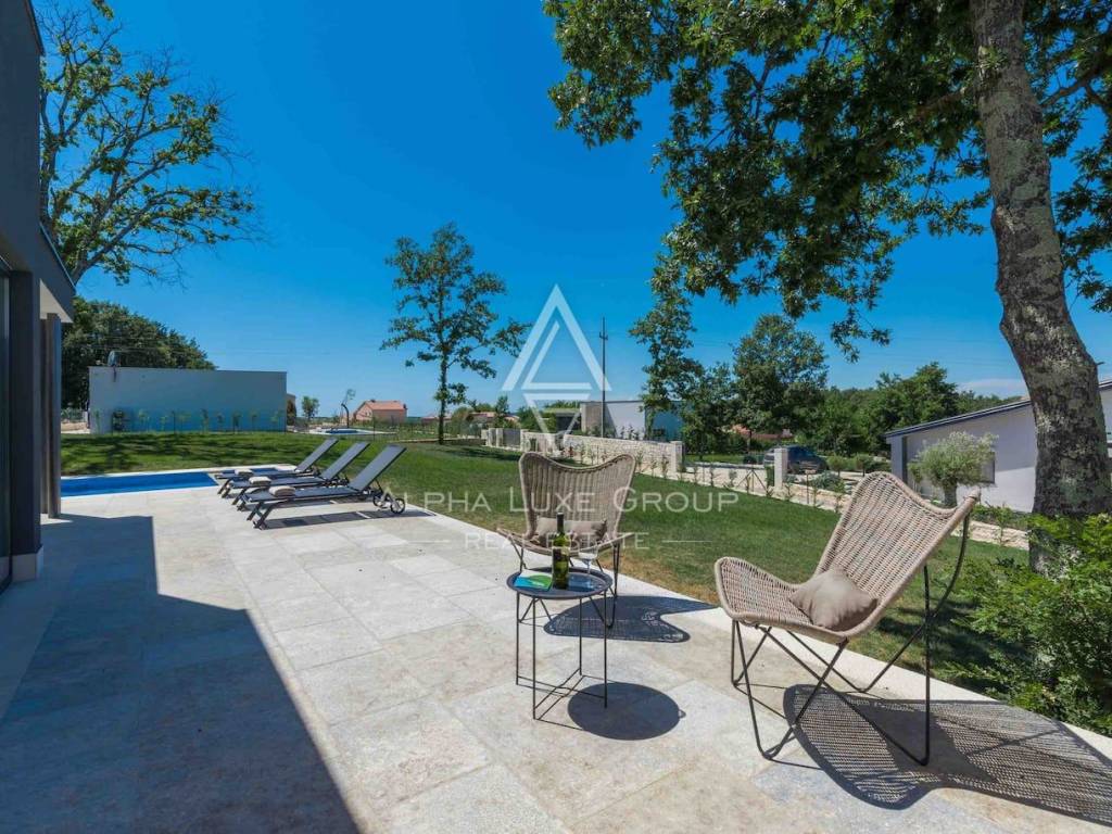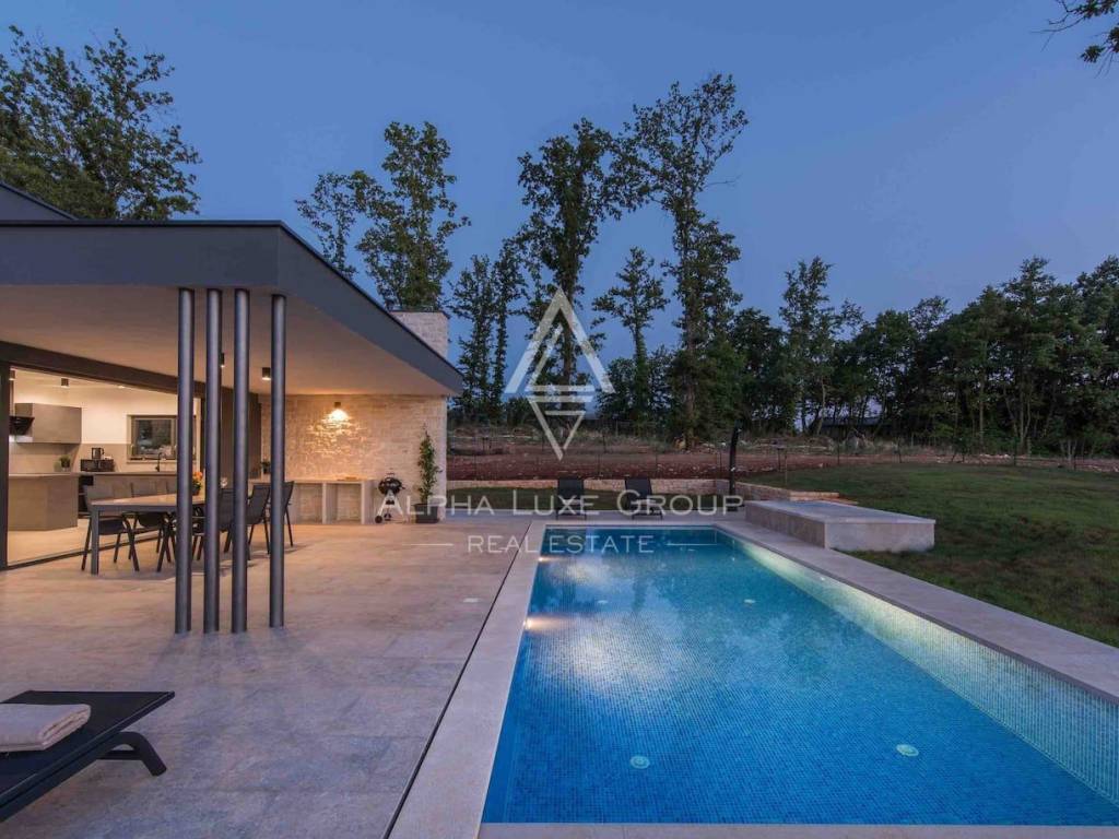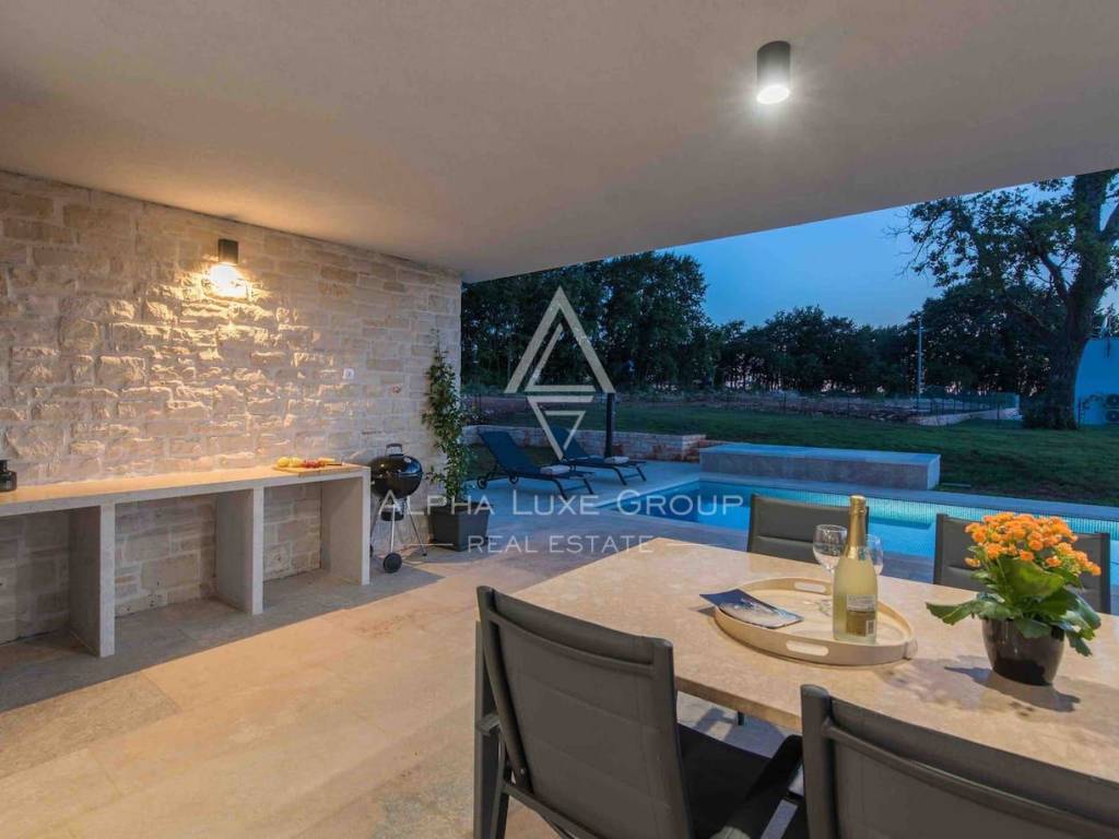 Situated on a generous 1527 m² plot in the peaceful surroundings of Žminj, this modern single storey home offers an exceptional blend of comfort, style and functionality. Designed for effortless everyday living, the property provides 140 m² of interior space featuring a bright open concept layout that connects the living room, kitchen and dining area. Large glass doors open from the living area onto a spacious terrace overlooking the pool and landscaped grounds, creating a seamless indoor outdoor flow.