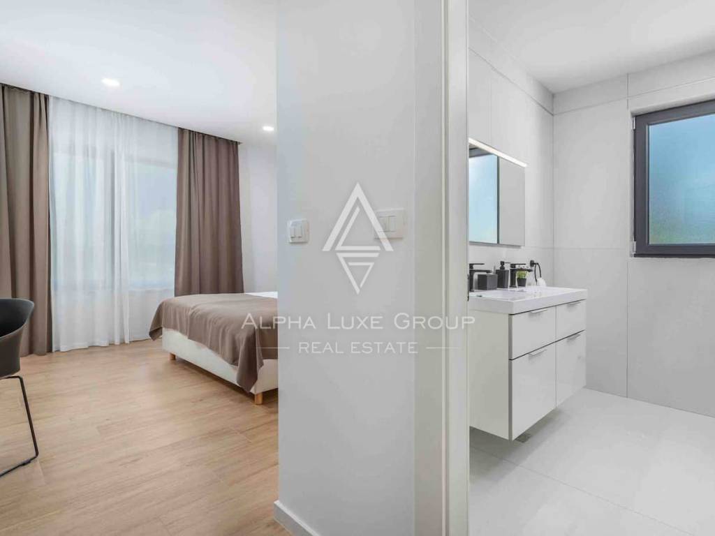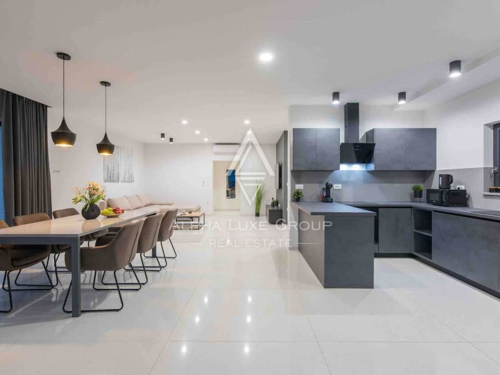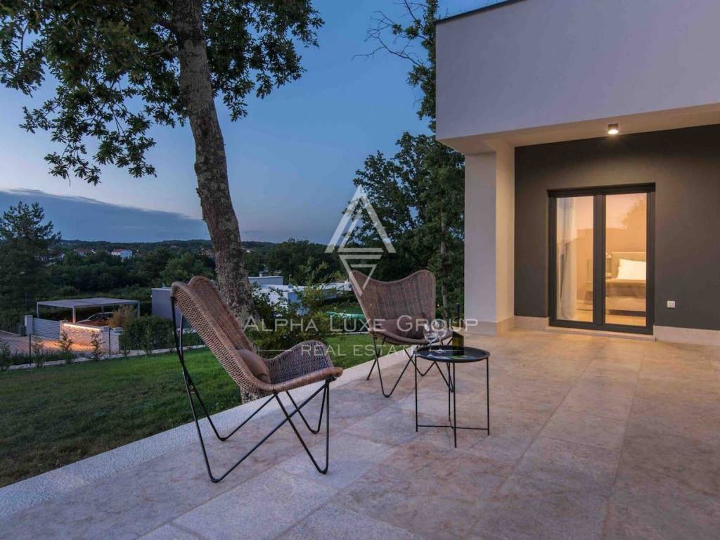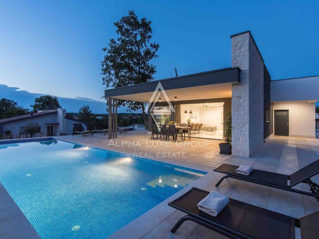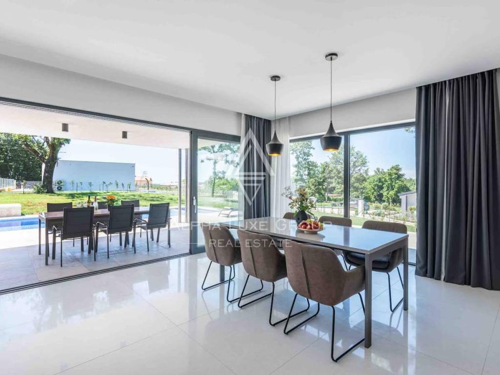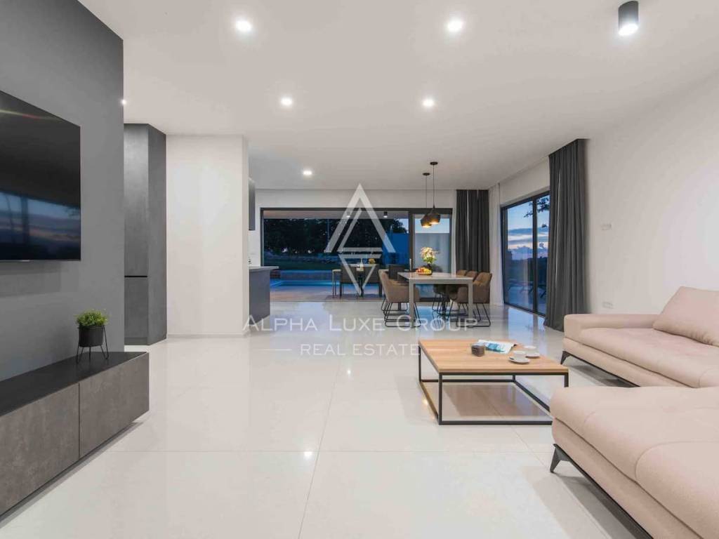Situated on a generous 1527 m² plot in the peaceful surroundings of Žminj, this modern single storey home offers an exceptional blend of comfort, style and functionality. Designed for effortless everyday living, the property provides 140 m² of interior space featuring a bright open concept layout that connects the living room, kitchen and dining area. Large glass doors open from the living area onto a spacious terrace overlooking the pool and landscaped grounds, creating a seamless indoor outdoor flow.