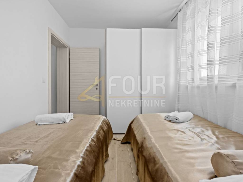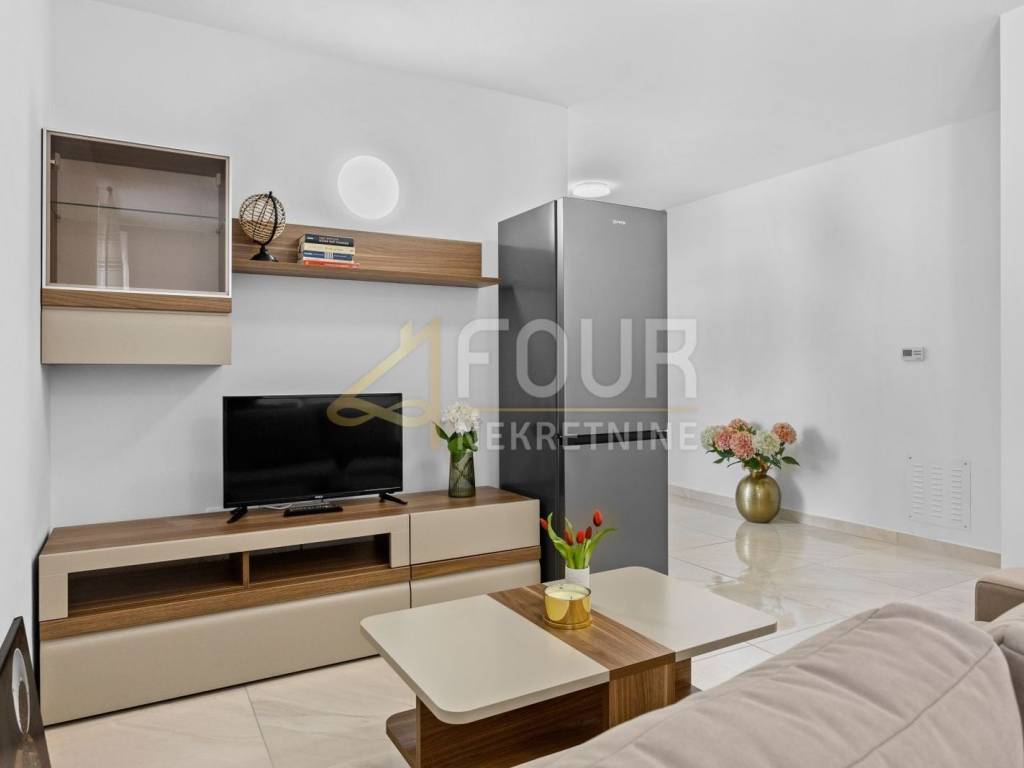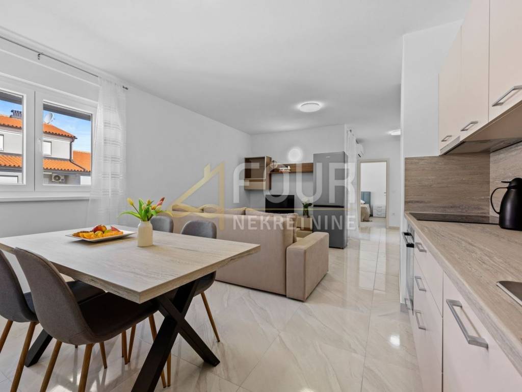 Peroj - a modern apartment in a newly built building from 2021 is for sale. With a total area of 57.17m2, the apartment has an ideal layout: it consists of a hallway, two comfortable bedrooms, a bathroom, a spacious living room connected to the dining area and kitchen, and a balcony of 4.02m2 with views of the surroundings. The apartment is equipped with underfloor heating in the bathroom, kitchen, and living room, PVC joinery with double-layer argon-filled thermal insulation glass and blinds, and heating and cooling are additionally provided by an air conditioning unit. Large-format quality ceramics are installed in the living room, kitchen, and bathroom, while ceramic imitation parquet is found in the bedrooms. The balcony features non-slip ceramics. The building has ETICS thermal insulation facade with 10 cm of insulation, and the exterior is landscaped with native Istrian plants. The price of the apartment includes sanitary ware and kitchen, while additional furniture is available at an extra cost of €7,000. The apartment also comes with an outdoor parking space paved with quality cobblestones for durability and easier maintenance. It is 950 meters away from the sea, and only 300 meters from the center of Peroj, making it an excellent opportunity for living, vacation, or investment.