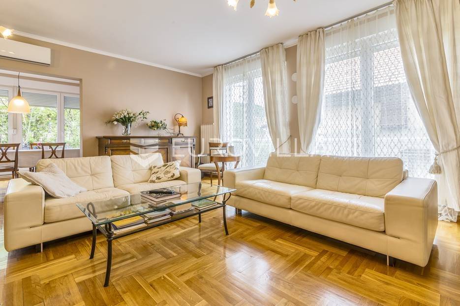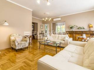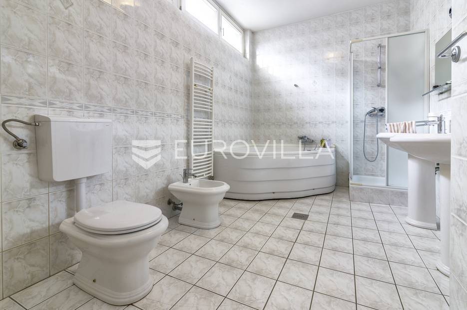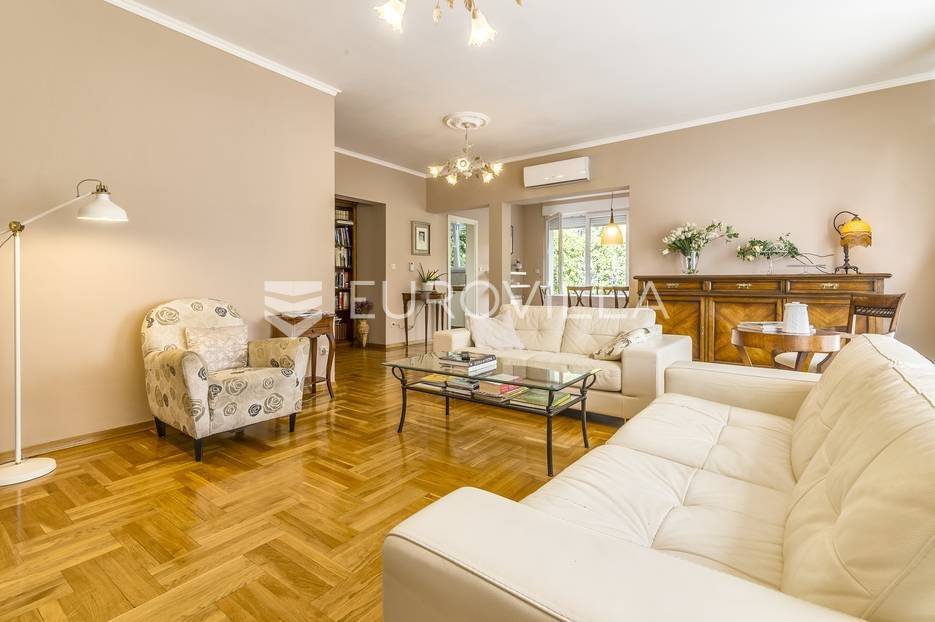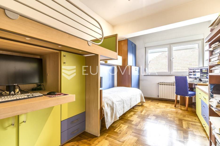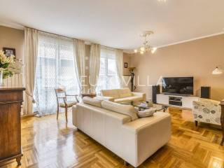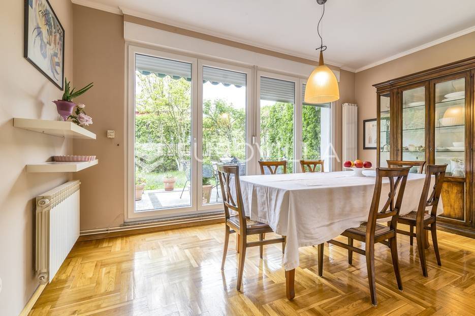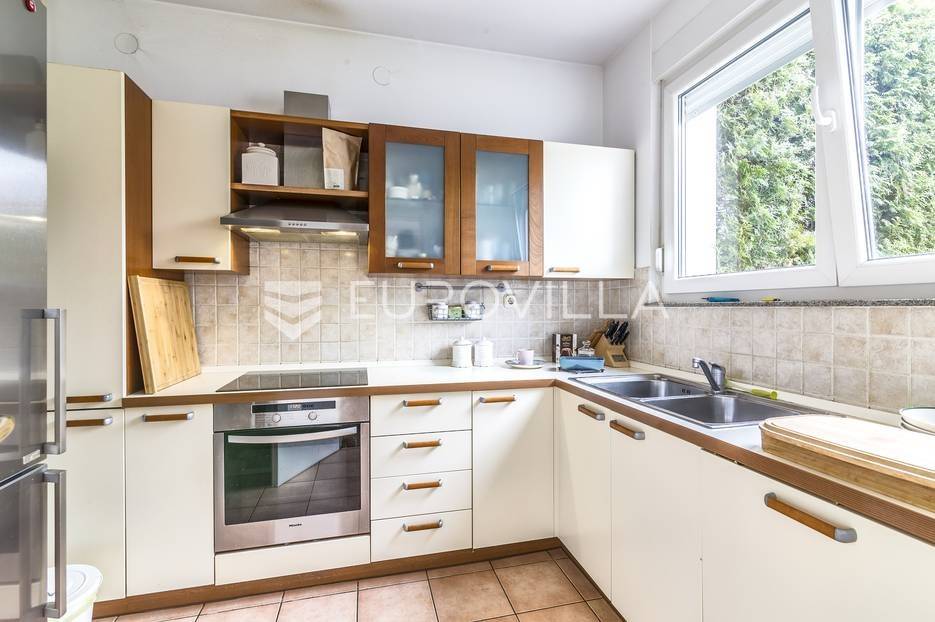 Mlinovi, dvoetažni prekrasan četverosobni stan zatvorene površine 130,55 m2 u novije građenoj (2000) ubanoj vili sa tri stana. Stan se sastoji od: terase s vrtom 108,18 m2 (10,8), dvije garaže 34,80 m2 (26,10), četiri spremišta 31,72 m2 (15,86). Ukupno NKP 183,33 m2. Prizemlje: ulazni hodnik, WC, boravak s blagovaonicom 46m2, kuhinja, ostava, izlaz na terasu i vrt. 1. kat: hodnik, 3 spavaće sobe, velika kupaona, spremište (vešeraj). Vrt je ograđen i uređen, skriven od direktnog pogleda. Zgrada i stubište u vrlo dobrom stanju, stan dobro održavan, renoviran 2013 (vanjska stolarija PVC Rehau sa sigurnosnim staklima i okovima). Grijanje - centralno etažno na plin, hlađenje – klima uređaji. Visina stropa 2.7 m. Protuprovalna vrata u stanu, protupožarna – garaže. Sve ostale informacije na upit.