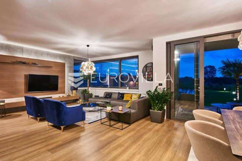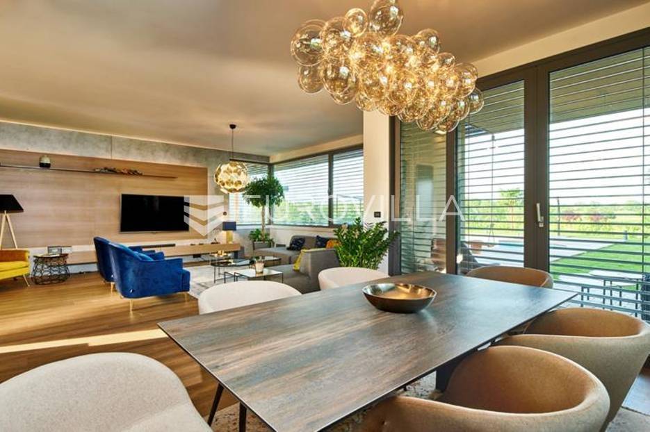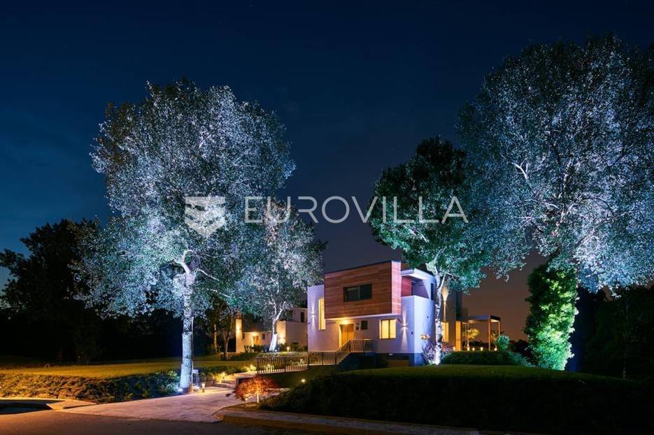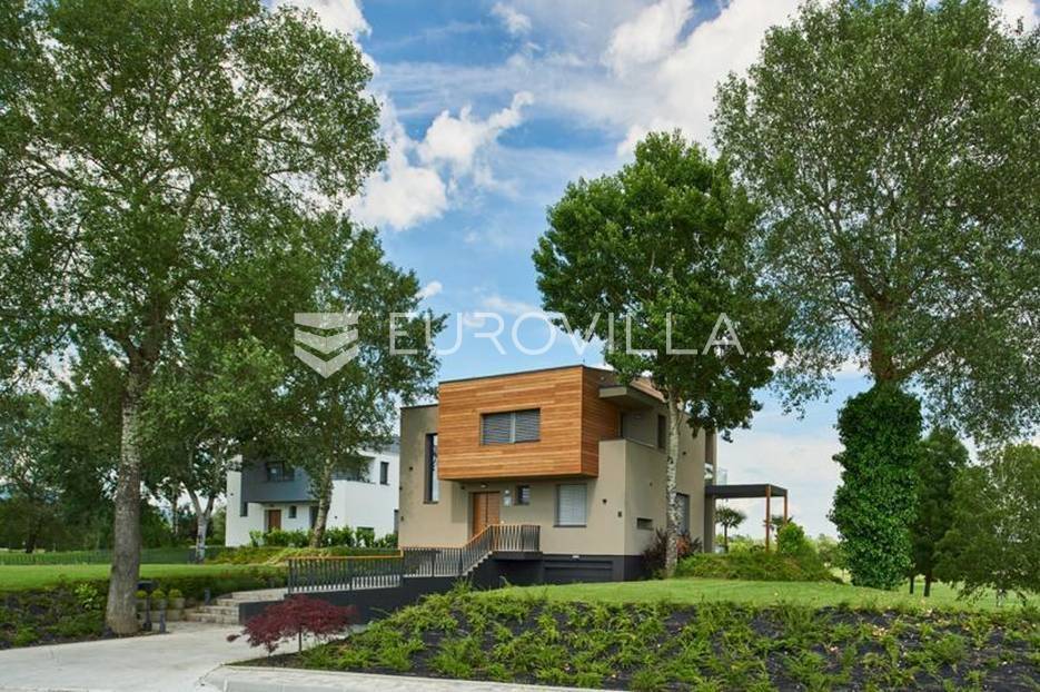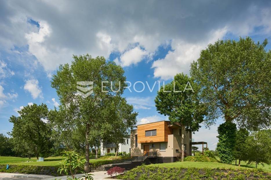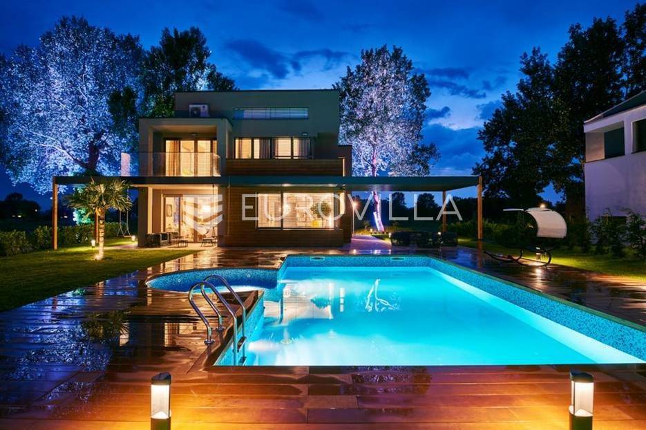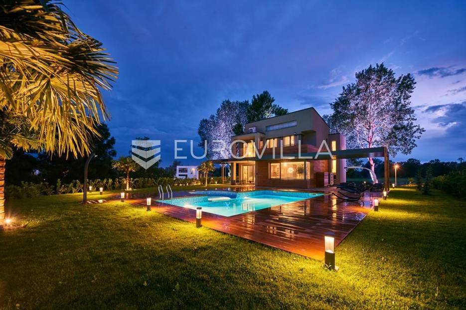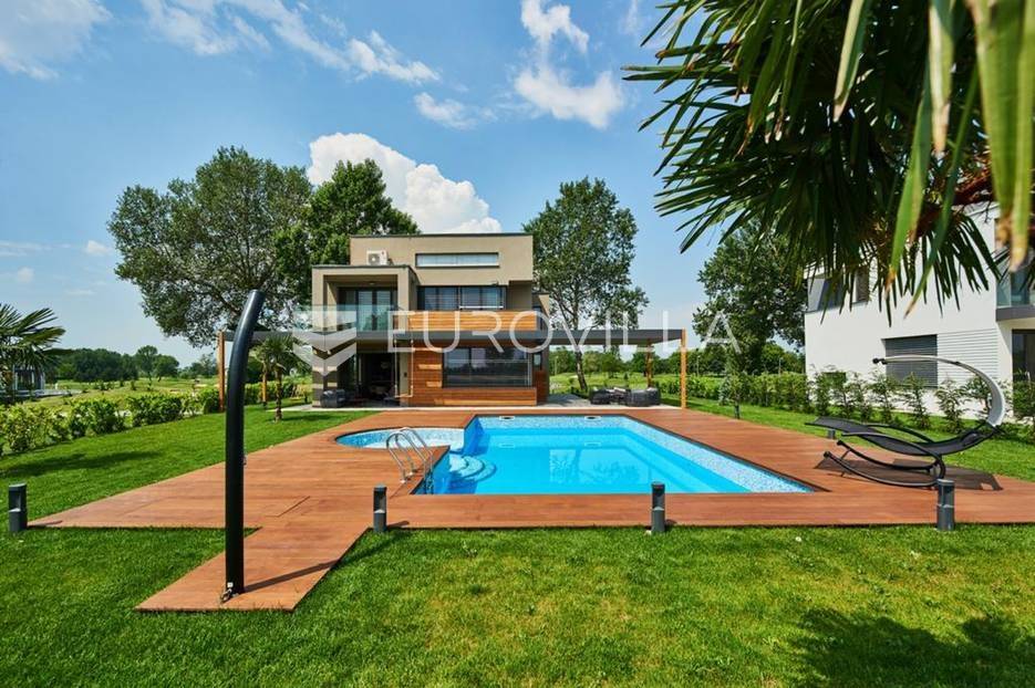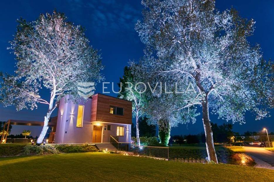 Golf tereni, Jadranska Avenija (Lanište), prekrasna obiteljska novoizgrađena samostojeća vila, uređena 2020 god. Razvedena u 3 etaža, ukupne neto korisne površine 300m2, smještena na zemljištu površine 800m2. Garaža za 1 automobil i parking za još 5 automobila.Suteren: kotlovnica, wellness, ostava, vešeraj.Prizemlje: ulazni hodnik, toalet za goste, garderoba, kuhinja, ogroman dnevni boravak s blagovaonicom. Iz boravka se izlazi na natkrivenu terasu i vrt i bazen.Kat: 3 spavaće sobe, 2 kupaonice.Odlična kvaliteta gradnje, protuprovalna ulazna vrata, dobra vanjska izolacija, alu stolarija s duplim staklima, žaluzine na električno upravljanje, grijanje na toplinsku pumpu stropno... Kompletno namještena i opremljena.Idealna za miran obiteljski život, samo nekoliko min od shoping centra Arena. Prekrasan pogled na mala jezera i golf terene.Minimalan rok 4 god. Ostale informacije na upit.