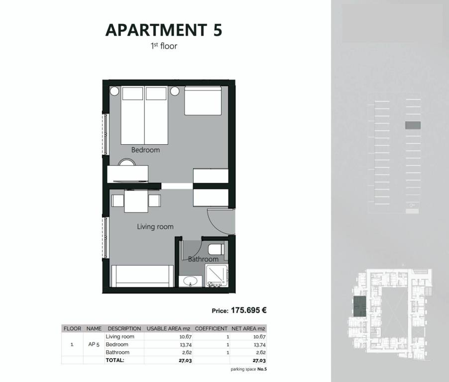 The interiors are finished with great attention to detail: bathrooms with kerok furniture resistant to water and impact, large-format ceramics, matte white sanitary ware with gold details, indirect lighting, designer interior doors and Diere security entrance doors. Apartments are equipped with a smart management system via app, while the entire complex is under video surveillance, ensuring safety and comfort.