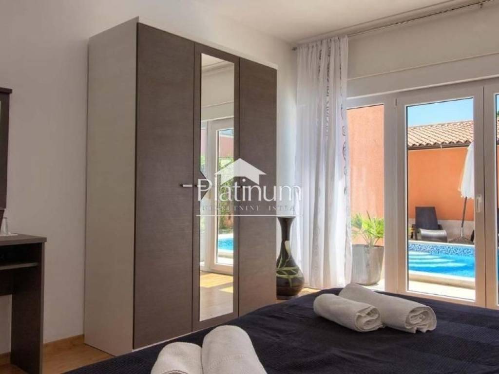 Prodaje se kuća s bazenom na tri etaže u Medulinu ukupne površine 380 m2. U prizemlju je veliki dnevni boravak sa kaminom, kuhinja i blagavaona, spavaća soba s kupaonom. Izlaz na bazen je omogućen iz dnevnog boavka kao i spavaće sobe. Na prvom katu su tri spavaće sobe svaka sa kupaonom i velika terasa na kojoj je jacuzzi. Dok su se na drugom na katu smjestile još dvije spavaće sobe sa zasebnim kupaonama. Okućnica je kompletno ograđena na kojoj je veliki bazen od 40 m2 pored kojeg je sunčalište i nakrivena terasa sa grillom. Udaljenost od mora 350 m.