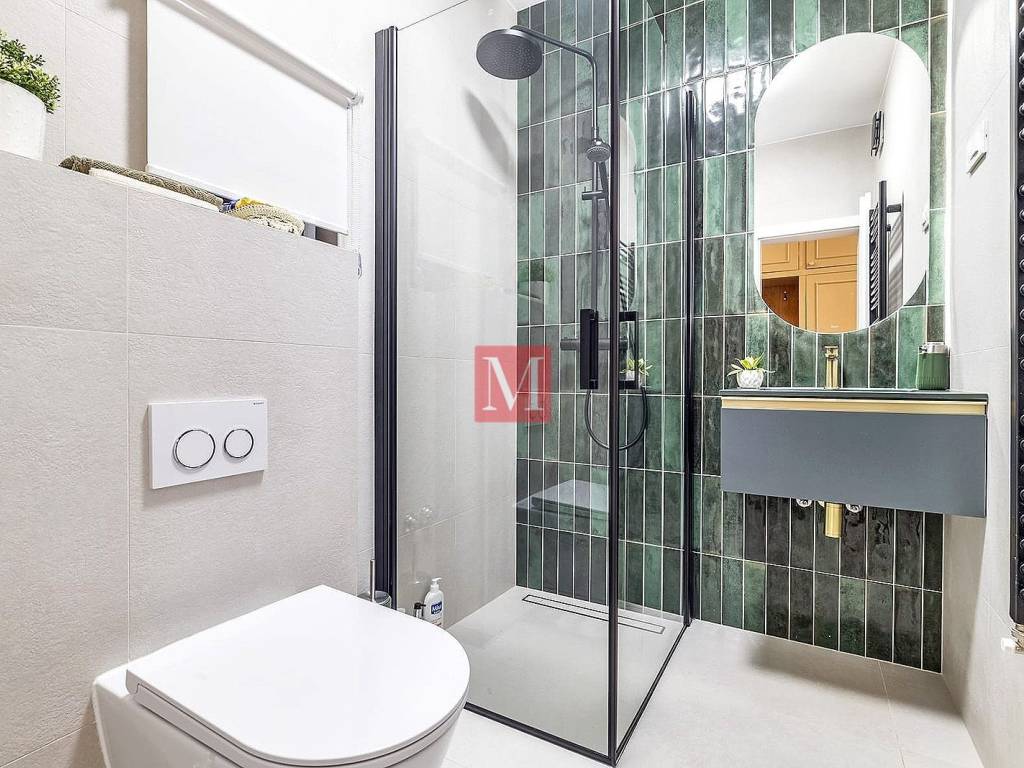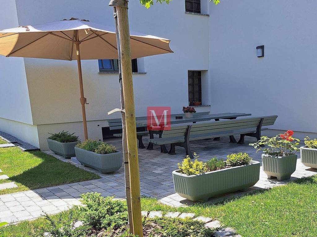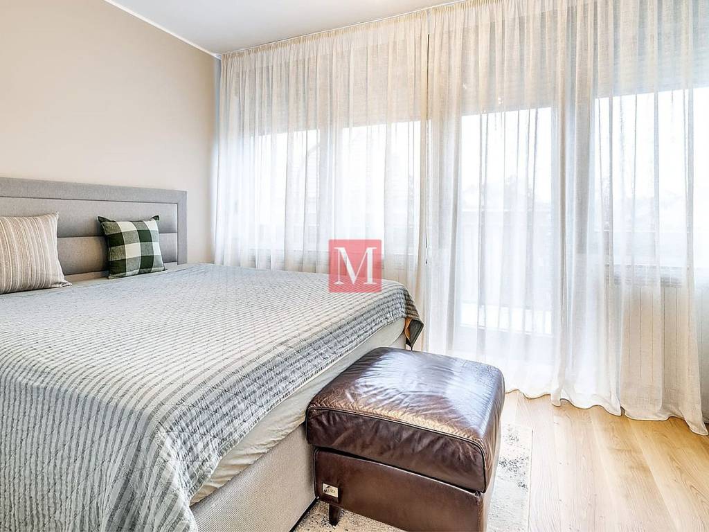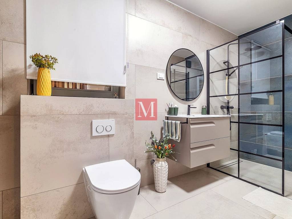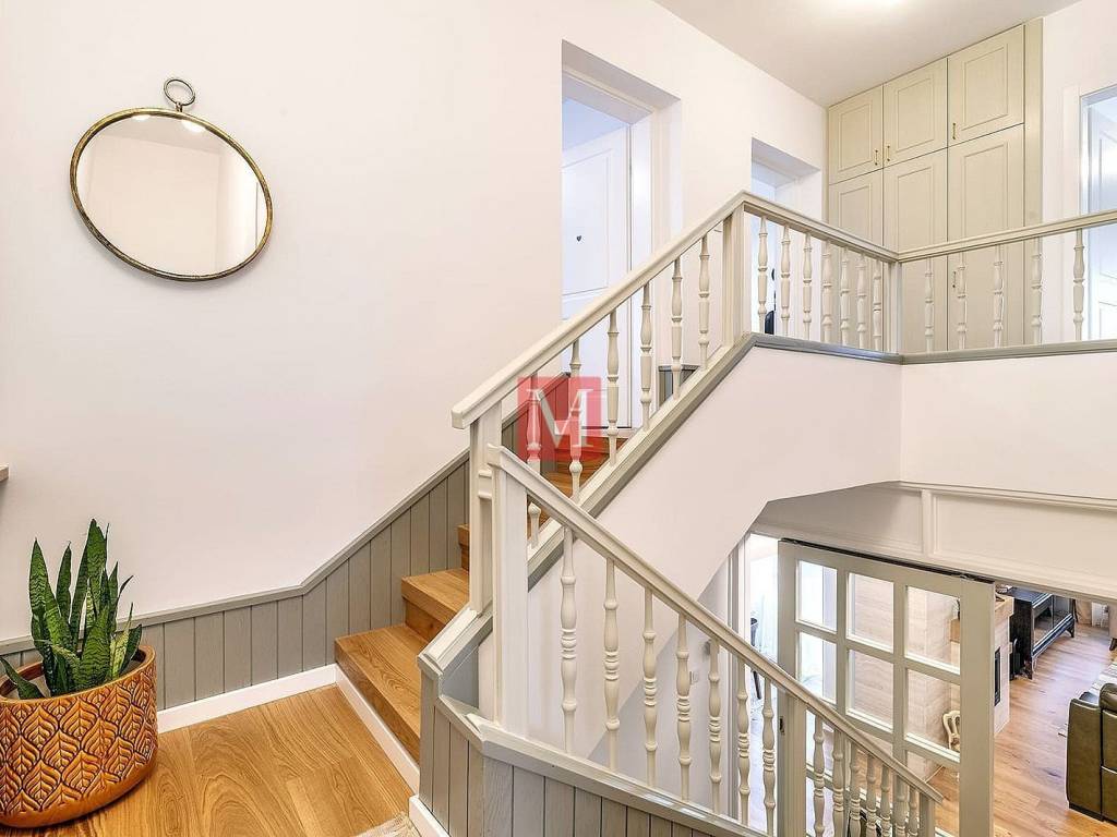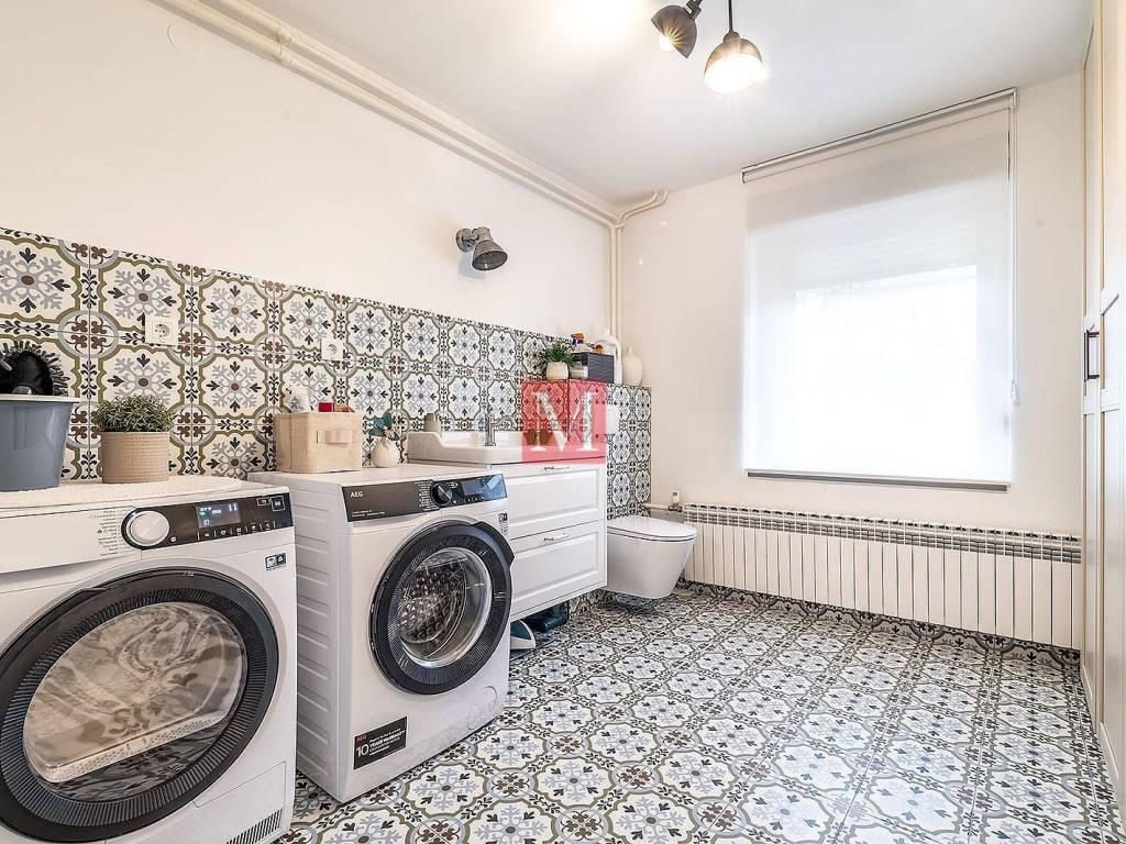 The ground floor includes a spacious garage, a functional laundry room, and an additional guest toilet. On the raised ground floor, there is a spacious entrance hallway, an elegant bathroom with a modern walk-in shower and toilet, as well as an open-concept kitchen, dining area, living room with access to a covered terrace and a workroom. After the high ground floor is a mezzanine with a master bedroom with a large balcony and an additional wardrobe. The first floor features two children's bedrooms, a bathroom with a shower, another living room, and a room used for rest and children's play. In the attic, a cozy library has been arranged.