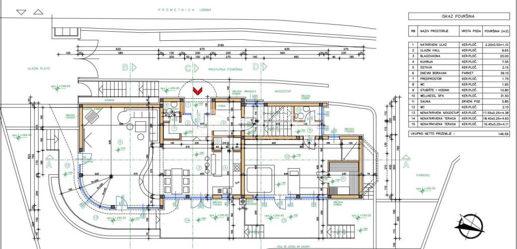 * Covered entrance, hallway, staircase, kitchen and dining room, living room, pantry, two toilets and wellness. The ground floor also has two uncovered terraces and a swimming pool.