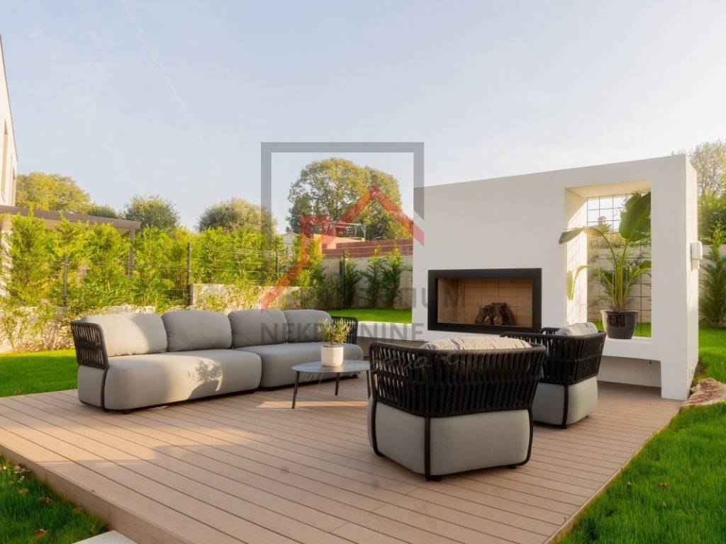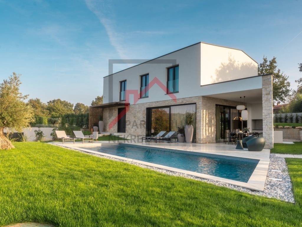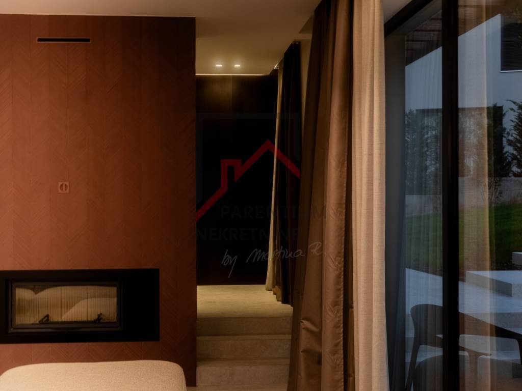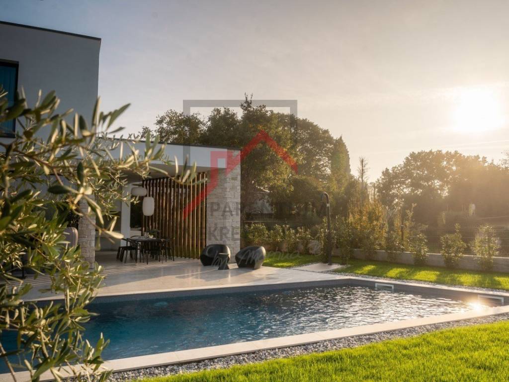 On the western coast of Istria, close to Poreč 14 km, Vrsar 10 km, and Rovinj 22 km, in greenery and away from city crowds, a perfect place for the rest of the spirit and body. A place you will never want to leave, a place for every serious hedonist.On a plot of 1000 m2, this is the last land in the building zone, offering an unobstructed view of orchards and olive groves that guarantee peace and intimacy, while the upper floor offers a view of the sea.The ground floor consists of a spacious utility room with washing machines and a boiler, a guest toilet, a fitness and sauna room or home office, a spacious living room, and kitchen. The stairs to the upper floor are lined with wood.The spacious living room is glazed on three sides with high lift-and-slide aluminum glass walls aligned with the floor without a threshold from the manufacturer 'Wicona'. In the ground floor, all curtains are motorized. The furniture and equipment used in the living room are from well-known Italian brands Novamobili, Copat cucine, DallAgnese, Slamp.