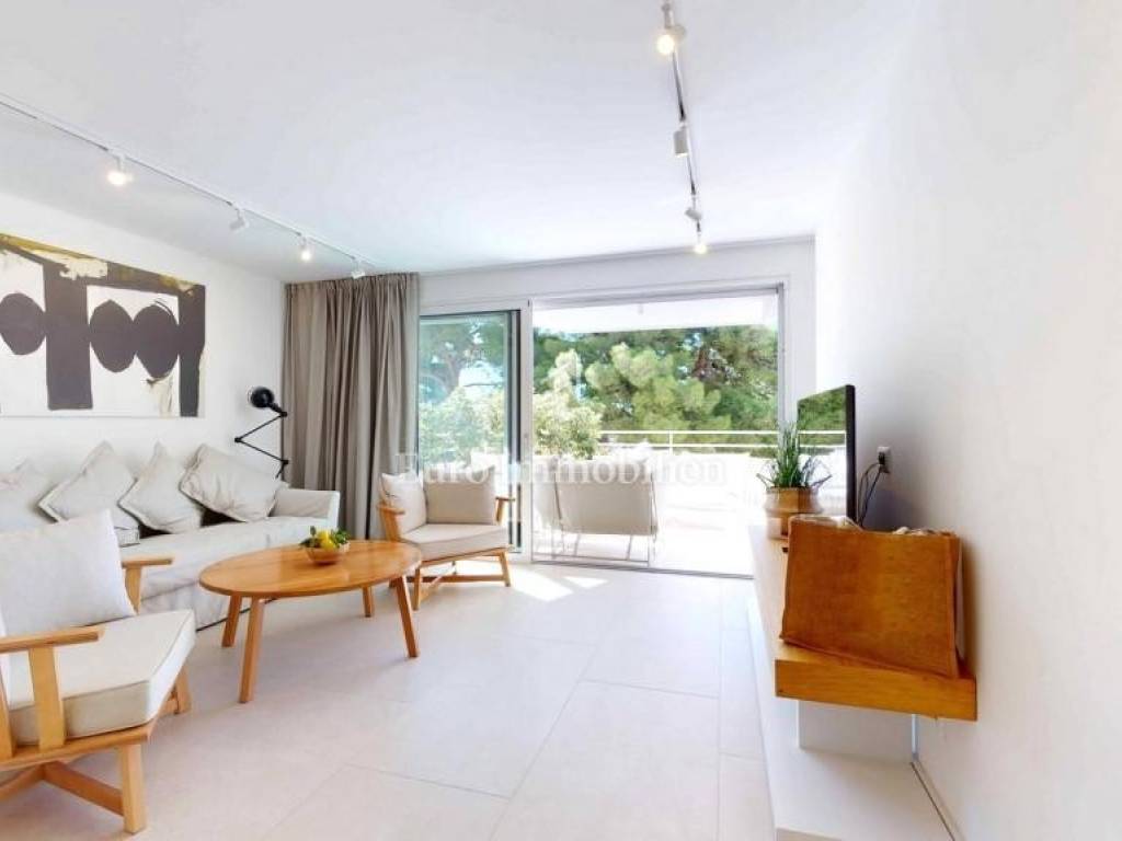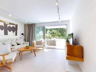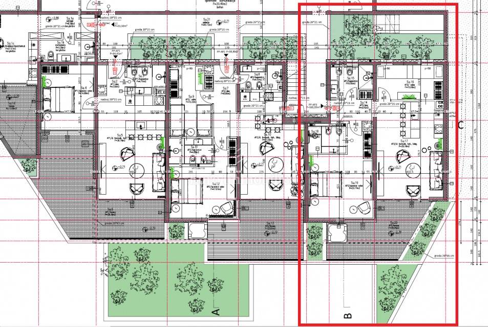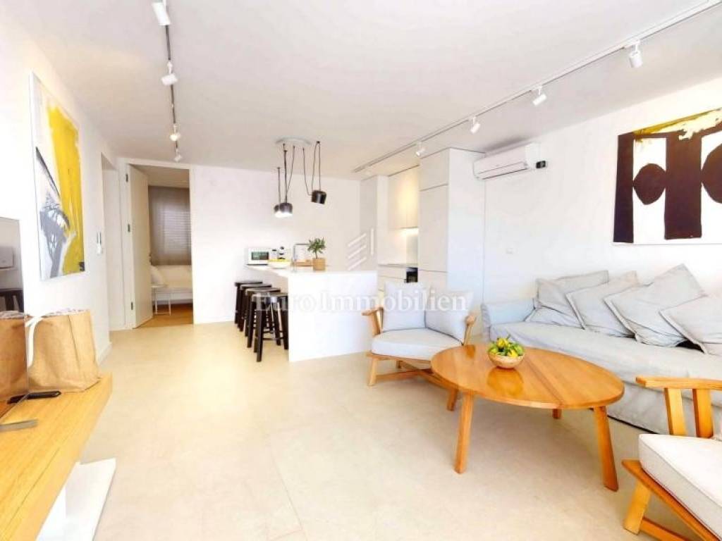 Modern new building with four floors and a total of 12 apartments, three on each floor. The apartments have similar floor plans and consist of an entrance hall, two bedrooms, one with its own bathroom, a bathroom and an open concept room that combines a living room, kitchen and dining room. The master bedroom and the living room open onto a spacious terrace with an outdoor shower.
