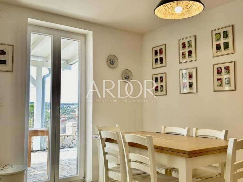 The island of Cres, Martinšćica, we offer a beautiful two-story apartment in a house near the sea. The apartment consists of a spacious kitchen, a bathroom with a window and a shower, a large storage room, a living room and a lounge with direct access to the garden completely paved with Istrian stone, with a partial view of the sea, and an outdoor kitchen equipped with a marble sink, a stove and a small refrigerator. On the upper floor there is a spacious bedroom with a double bed and another room with two single beds, a bathroom with a window and a bathtub. Outside, there is a large basement room arranged as a boiler room with a laundry room. It has an outdoor parking space, and the house is sold fully furnished. Heating is provided by electric radiators, and cooling by air conditioners.