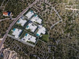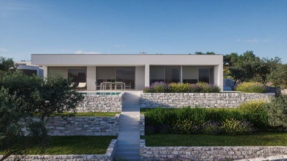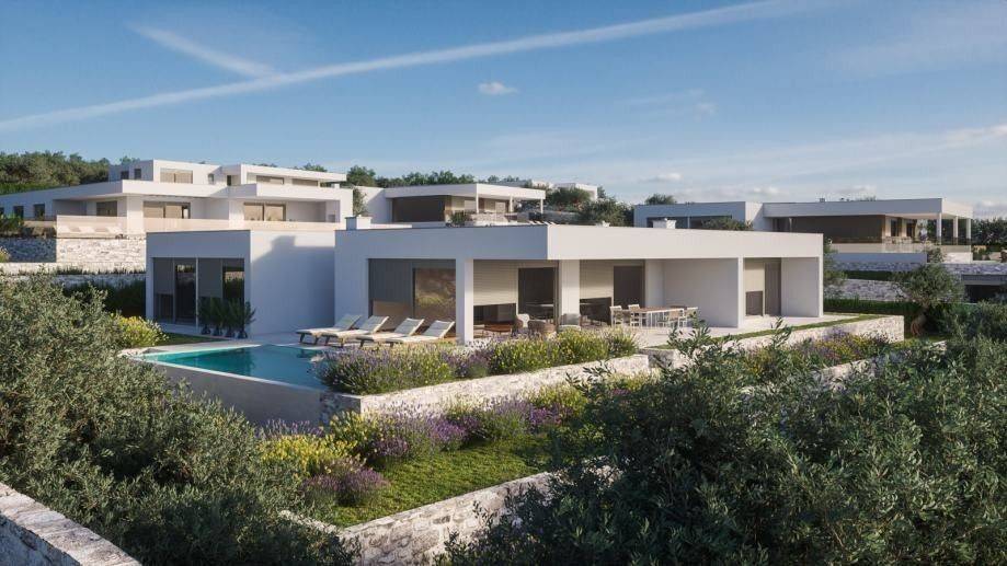 The villa is located in a modern complex with 8 luxury villas.The special feature of this complex is that all the villas are built and positioned in such a way that they have an open view of the sea.The villa is a one-story house with a total area of 245 m2.It consists of 4 bedrooms with private bathrooms, a large living room with a kitchen and dining room, spacious terraces with a view of the sea, a separate toilet. gym, storage room, laundry room, spacious corridors and garage with one parking space.The yard was conceived as a landscaped garden with Mediterranean plants, a sunbathing area and a swimming pool.The highest quality materials are used in the construction process, and the villa is equipped with the most modern equipment.We are available for more information.The agency commission is 3% + VAT of the achieved purchase price.