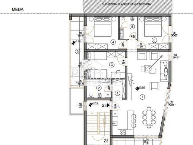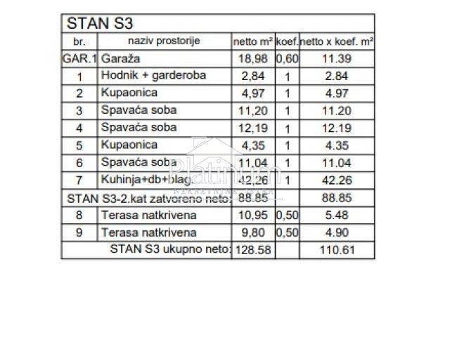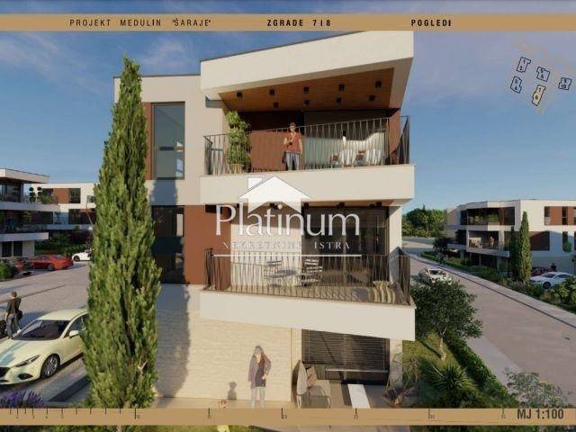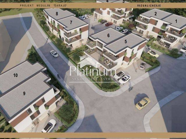 MEDULIN ISTRA The location is approximately 900 m from the sea. It is a project of 10 residential buildings each with three apartments. There will be a total of 30 apartments, distributed on the ground floor, first and second floor. The apartments are sold on a turnkey basis, with complete carpentry, equipped bathroom, security doors, and air conditioners. Start of construction: end of 2022 Planned completion of construction: end of 2023 The contractor is a company with many years of experience in the construction of residential buildings. The apartment consists of: Living room with dining room and kitchen - 42.26 m2 3 bedrooms 2 bathrooms Terrace - 10.95 m