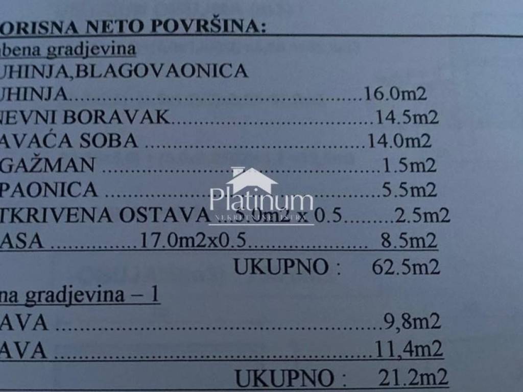 In Pula, in a quiet location, this single-storey house with an auxiliary building is for sale. The house consists of a kitchen with a dining room, living room, bedroom, utility room, bathroom, covered storage room and terrace. In the second part there is a living room with a kitchen, bedroom and bathroom. Private parking for two cars. Heatin