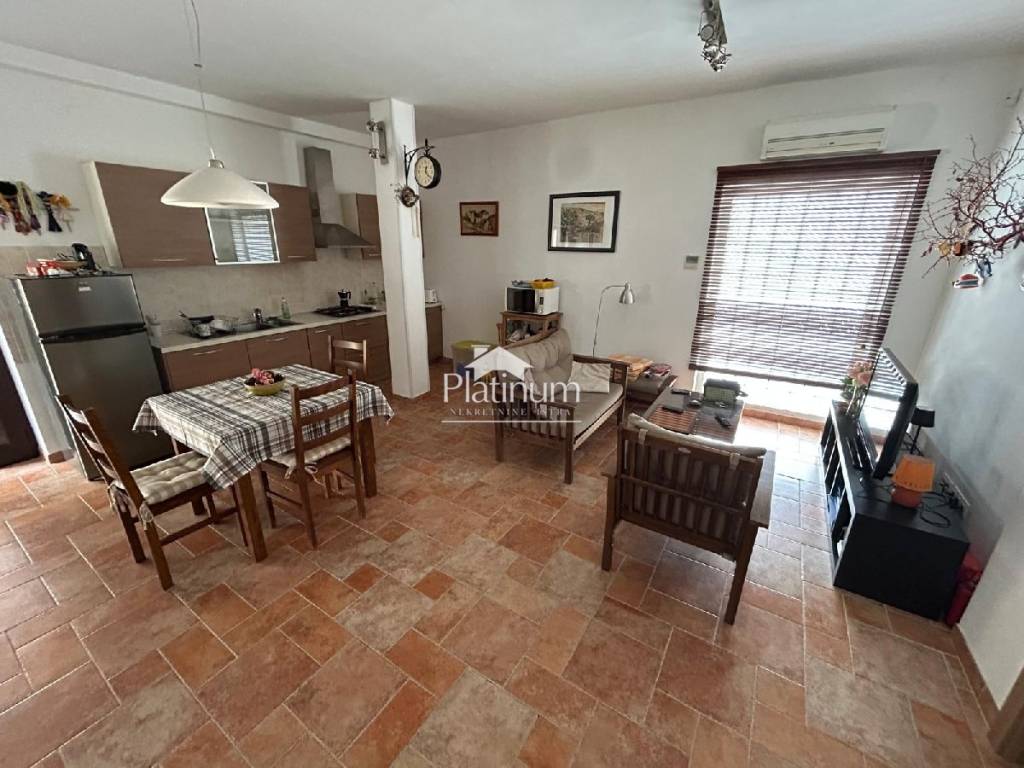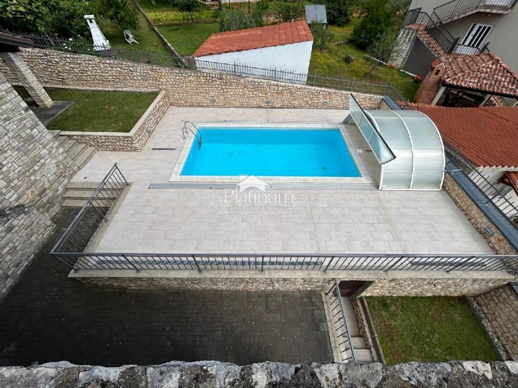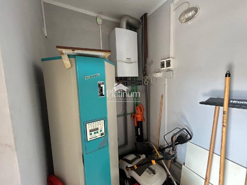 In Pula, in a sought-after location, this detached stone house consists of two parts with separate entrances. In the lower part there are two garages of 20m2 each, a basement and a 60m2 apartment with a separate entrance consisting of a living room with kitchen, two bedrooms, a toilet and a bathroom and an outdoor covered terrace connected to the swimming pool. On the first floor there is a 110m2 apartment consisting of an entrance hall, a living room with a dining room, two connected covered terraces, three bedrooms and one small auxiliary room, a toilet and a bathroom. All rooms are equipped with air conditioning. Stairs lead down to the 24m2 swimming pool which has the possibility of being covered. Aluminum joinery, parquet floors and ceramics. Heatin