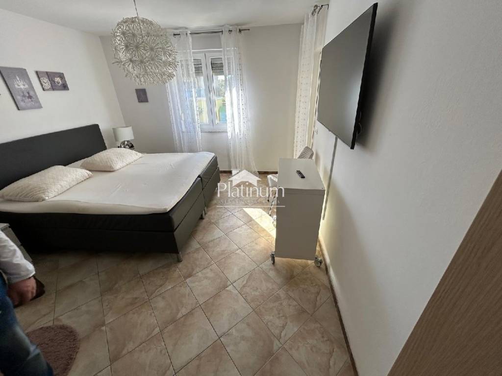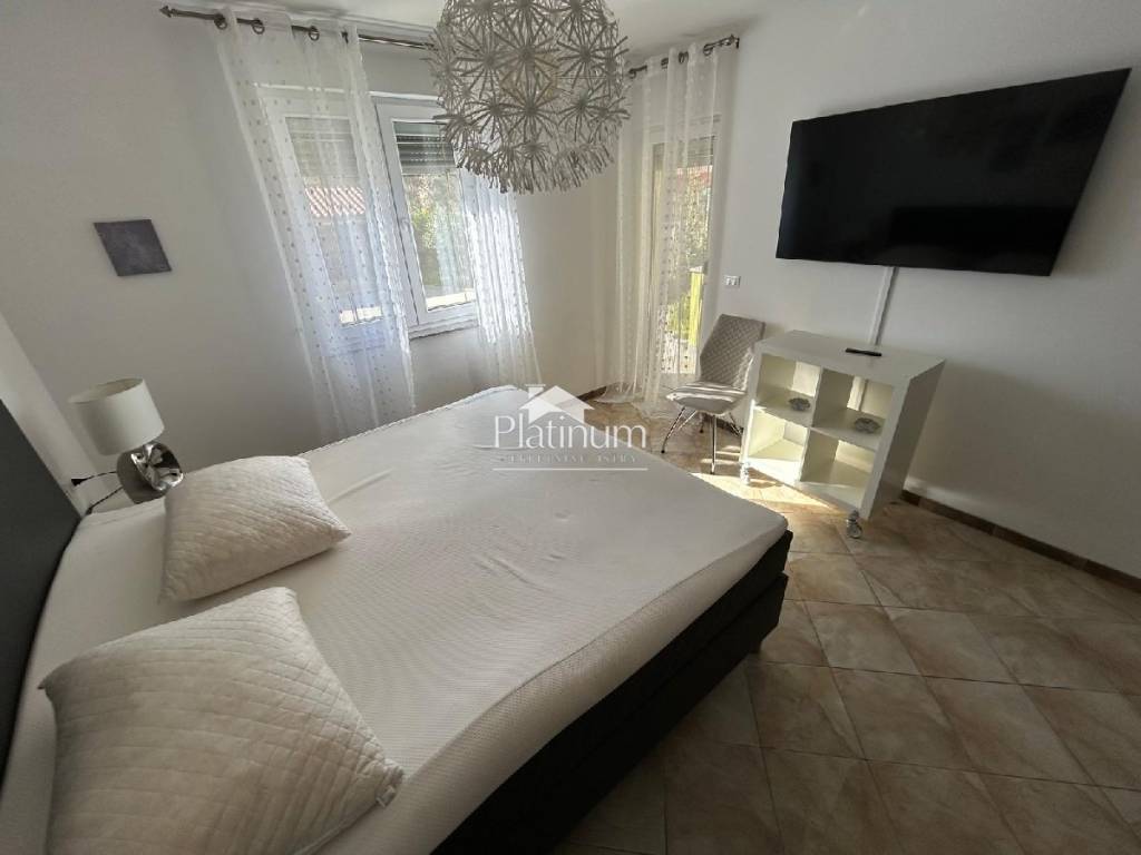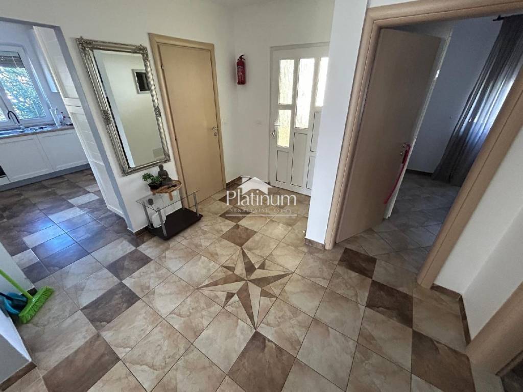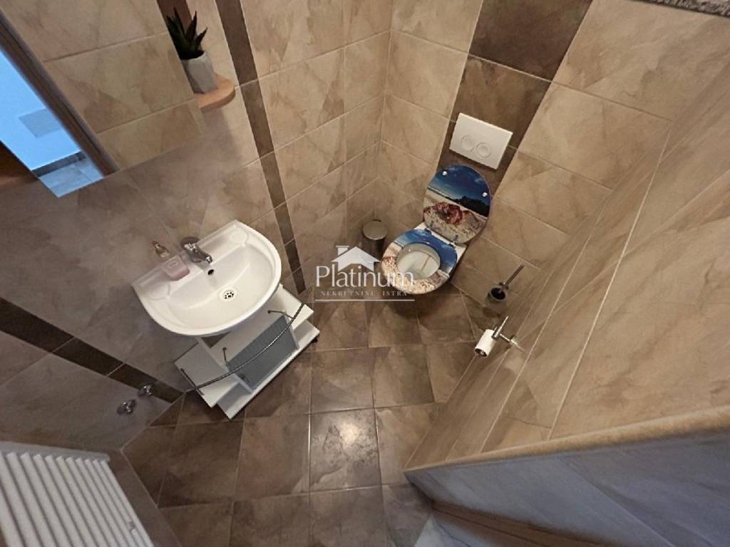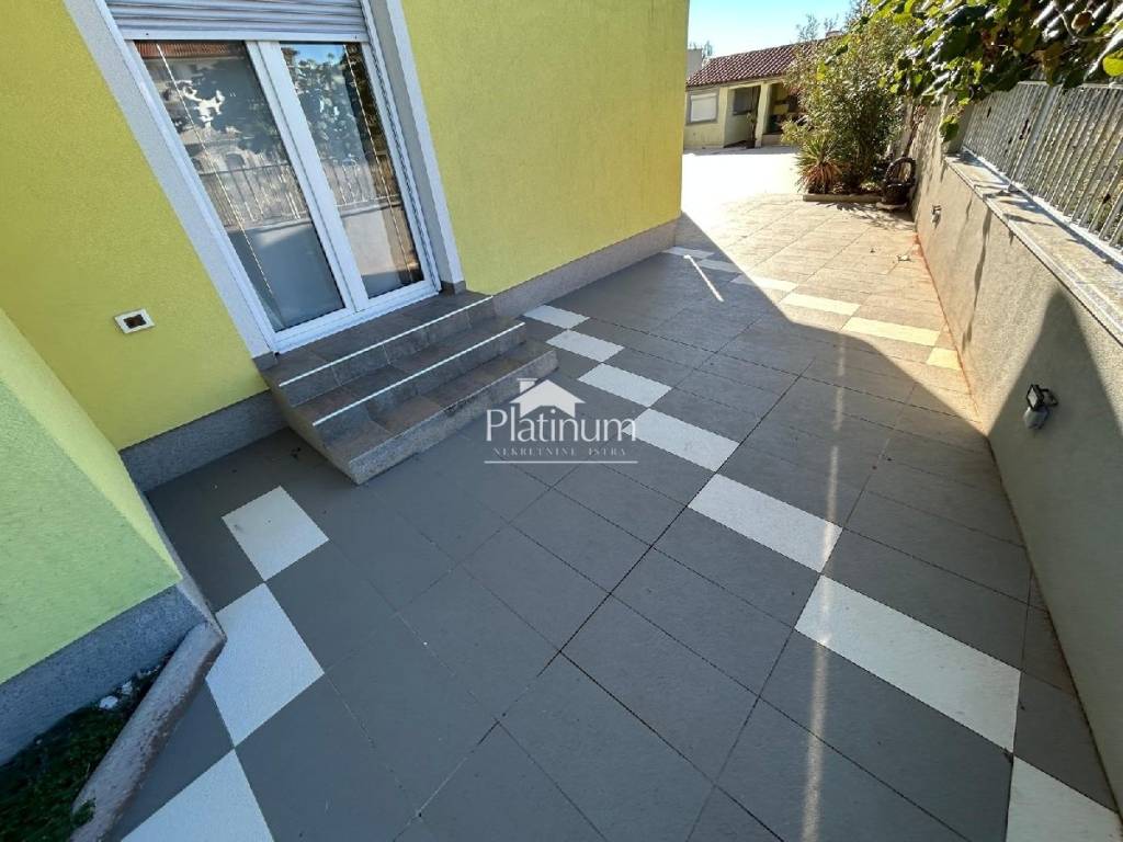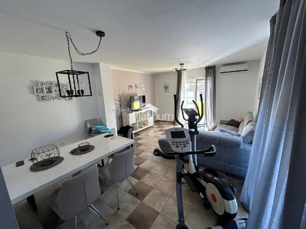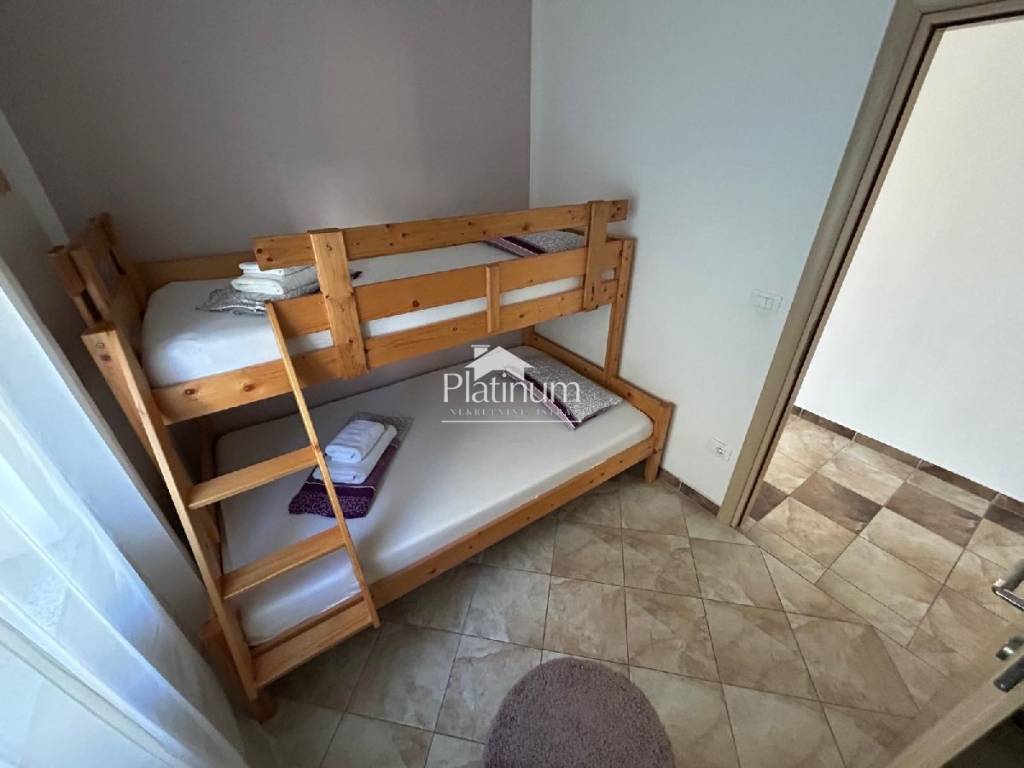 In the vicinity of Peroj, in a quiet place, there is this fantastic house consisting of a ground floor and an upper floor. On the ground floor is a comfortable apartment consisting of an entrance hall, bathroom, storage room, kitchen connected to the living room with access to the terrace from which you can go down to the pool, three bedrooms and a bathroom. On the first floor there are two apartments, one with one bedroom, bathroom, kitchen with living room and access to a covered terrace with a partial view of the sea. The second apartment consists of two bedrooms, a hallway, a bathroom and a kitchen with a living room that also leads to the terrace. In the yard there is a swimming pool with a sunbathing area, a covered area with a fireplace, a summer kitchen and a toilet. On the front side of the yard, there is one parking space and an entrance through the garage through which you can extend and park next to the house. The house has PVC joinery with mosquito nets, ceramic floors. Heatin