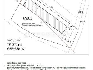 Prodaje se građevinsko zemljište pravilnog oblika površine 1134 m2. Veći dio zemljišta (cca 557 m2) se nalazi u zoni stambene namjene, dok je preostali dio u zoni zelene površine.