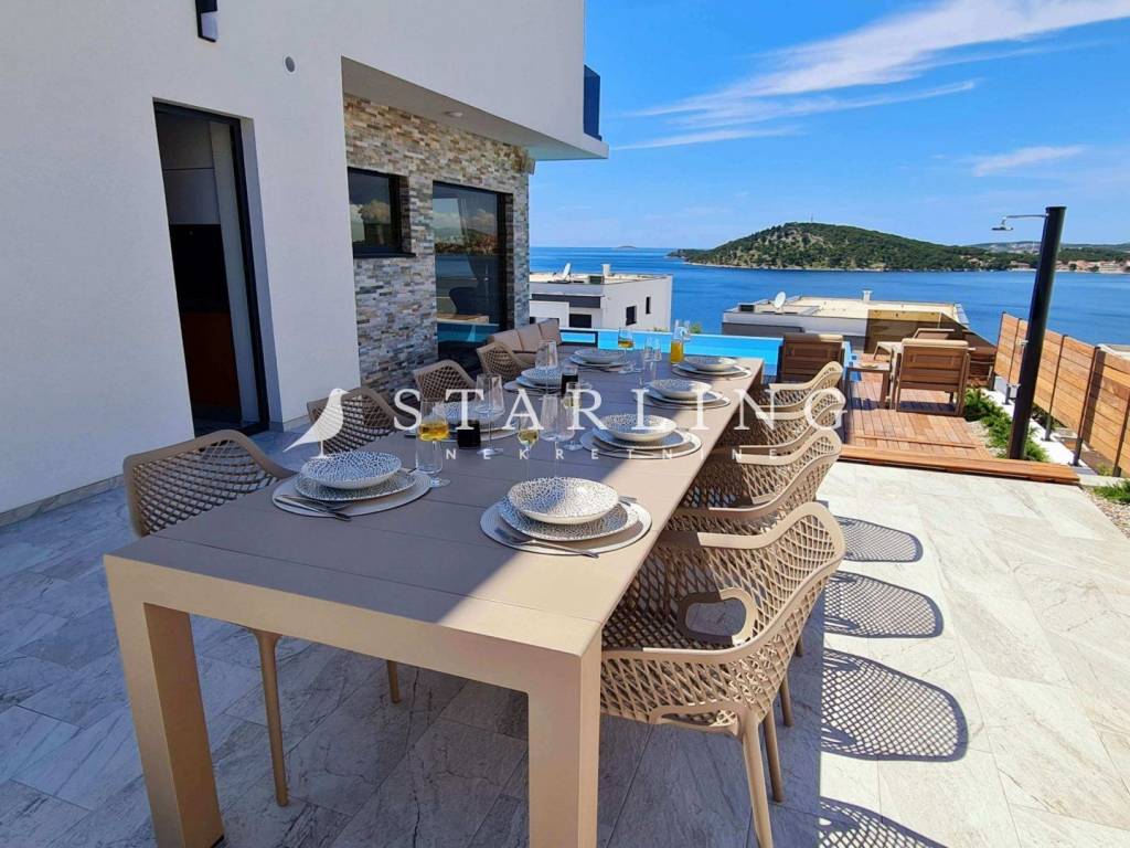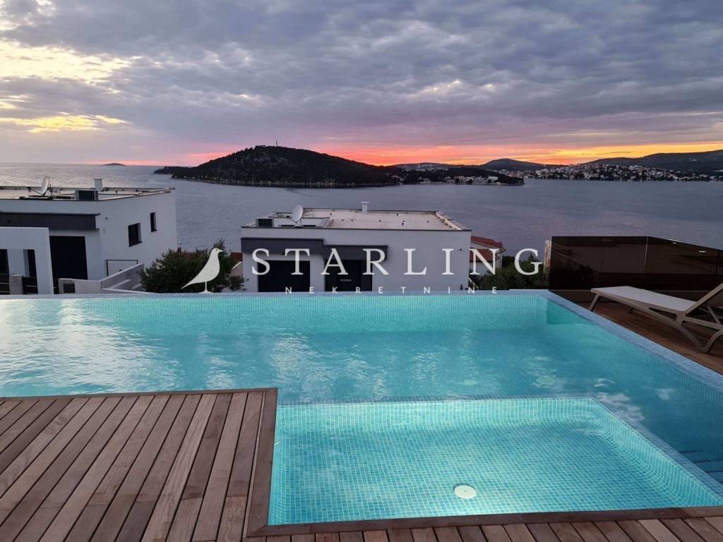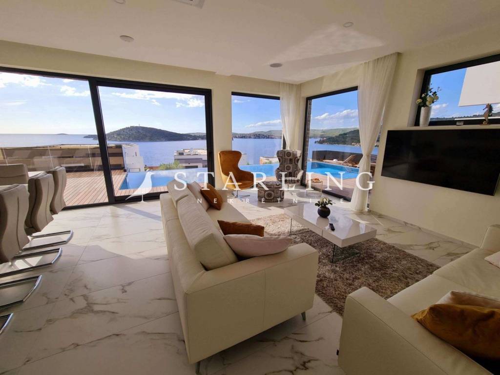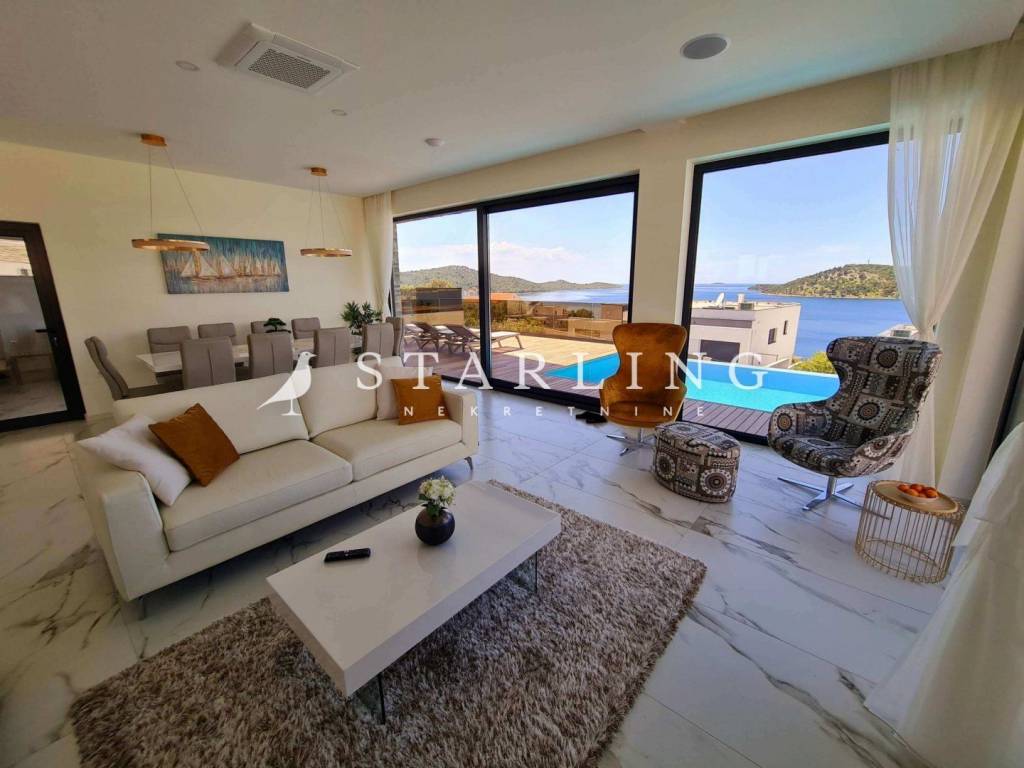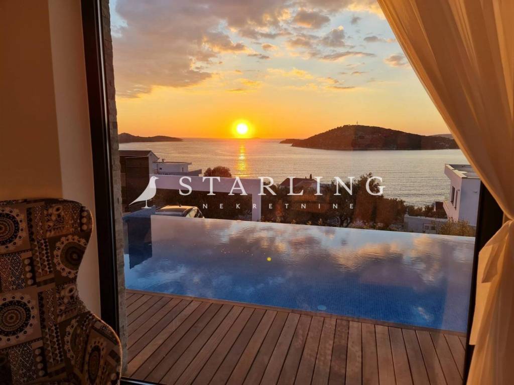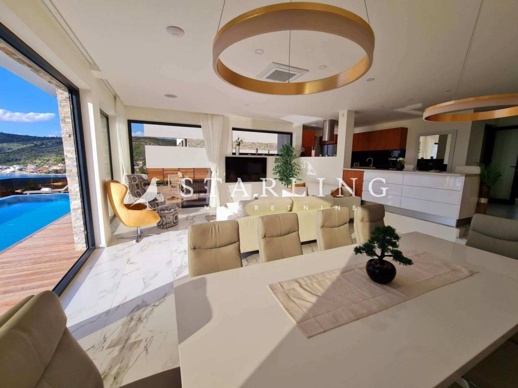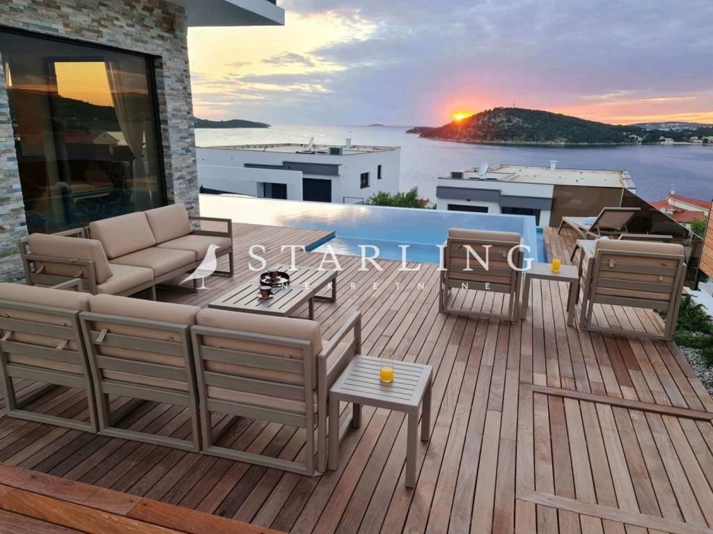 LUXURY VILLA WITH SEA VIEW, FOR SALE, ROGOZNICA, RAŽANJ, 260 m2 This modern villa is located in a row of a luxury complex of 3 sister villas. All three villas have the same concept and design. This villa consists of: GARDEN: heated swimming pool (38 m2), terrace, landscaped lawn and driveway with parking for 3 vehicles. GROUND FLOOR: open-concept kitchen connected to the living room and dining room, bedroom with private bathroom, toilet, sauna with shower, laundry room, storage room, and exit from the living room to the outdoor terrace through a large glass wall. FIRST FLOOR: 4 bedrooms with private bathrooms and wardrobe. Luxury villa, 260 m2, is located in a quiet Dalmatian town near Rogoznica in a closed complex of villas. A combination of modern architecture and natural surroundings with a unique view of one of the most beautiful sunsets that sets directly into the sea, this villa is a hit! Four fully equipped bedrooms with double beds are located on the upper floor with a beautiful view of the sea. Each room has its own private bathroom with toilet. On the ground floor there is a spacious living room, kitchen, dining room and laundry room with a washing machine and dryer, a separate bathroom and a wellness room with a sauna and a hot tub where you can fully indulge in all the pleasures of wellness relaxation with a beautiful view of the sunset. On the large terrace of 140 m2 (110 m2 of teak) there is a heated infinity pool. In addition to heating, the 1.45 m deep and 10 m long pool has a cooling option and includes a children's pool. The location of the villa provides shade and sun throughout the day. There is a parking lot with three parking spaces in the completely fenced yard of the villa. Near the villa there is a pebble beach typical of the Dalmatian coast. The enchanting sea coast hides various specialties that are located in the immediate vicinity of the villa. One such place is Zmajevo oko, a small salt lake located on the Gradina peninsula near Marina Frapa. A little further away is hidden Plava uvala, perfect for idyllic afternoons in the company of loved ones. If you want to rent a boat or reach the villa with your own boat, you have a private mooring at the nearby Frapa Marina. In a position that ensures complete privacy and peace, not far from the villa there are various amenities such as bars, restaurants, shops, etc. For all those who prefer sightseeing and exploring cultural and historical monuments, the historical cities of Šibenik in the north and Split in the to the south. Orientation: North - South Built: 2019 Parking: 3 places Price: 1,550,000 EUR