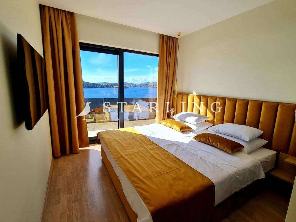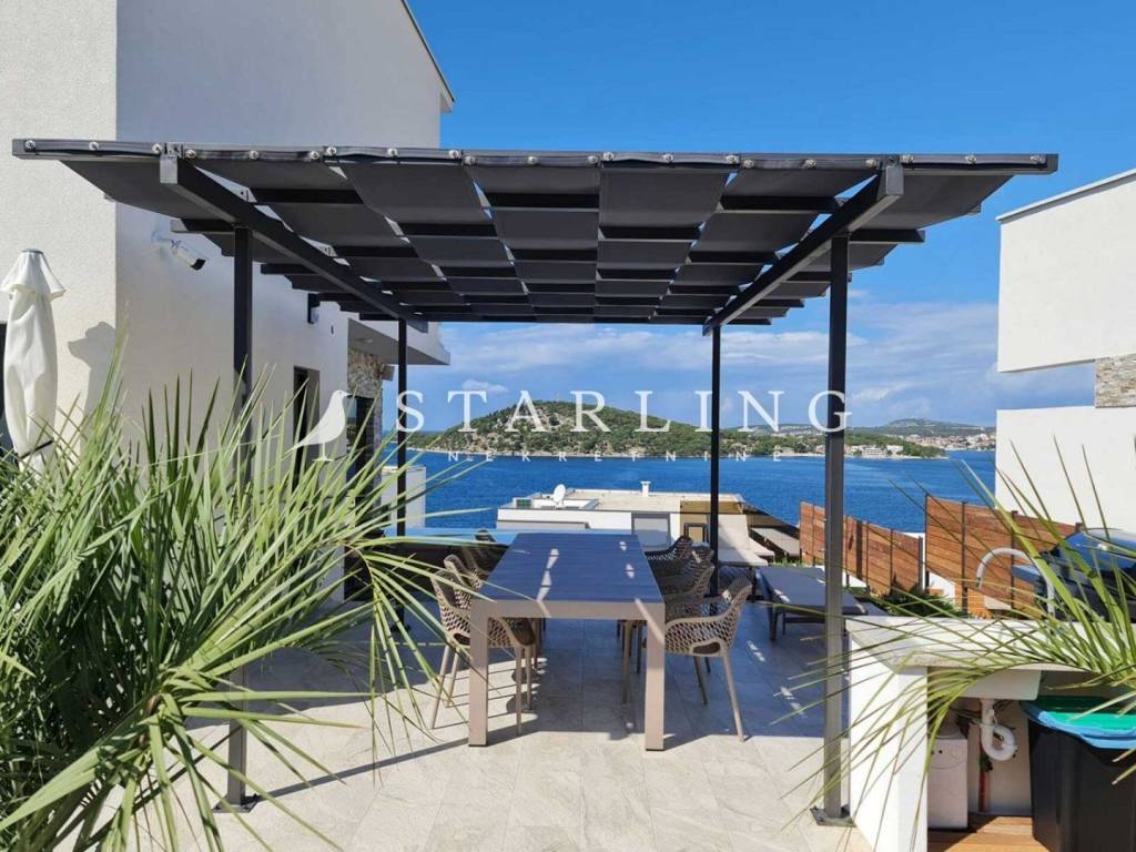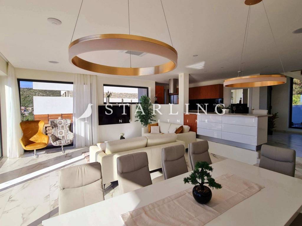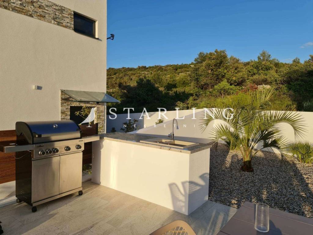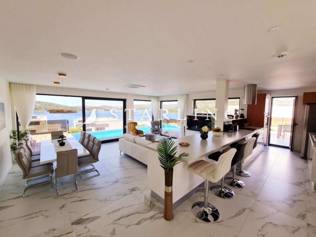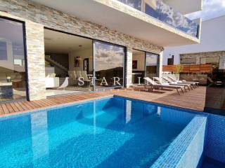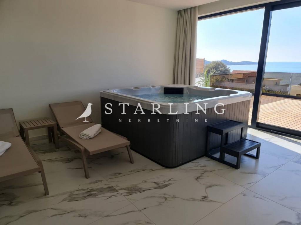 LUXURY VILLA WITH SEA VIEW, FOR SALE, ROGOZNICA, RAŽANJ, 260 m2 This modern villa is located in a row of a luxury complex of 3 sister villas. All three villas have the same concept and design. This villa consists of: GARDEN: heated swimming pool (38 m2), terrace, landscaped lawn and driveway with parking for 3 vehicles. GROUND FLOOR: open-concept kitchen connected to the living room and dining room, bedroom with private bathroom, toilet, sauna with shower, laundry room, storage room, and exit from the living room to the outdoor terrace through a large glass wall. FIRST FLOOR: 4 bedrooms with private bathrooms and wardrobe. Luxury villa, 260 m2, is located in a quiet Dalmatian town near Rogoznica in a closed complex of villas. A combination of modern architecture and natural surroundings with a unique view of one of the most beautiful sunsets that sets directly into the sea, this villa is a hit! Four fully equipped bedrooms with double beds are located on the upper floor with a beautiful view of the sea. Each room has its own private bathroom with toilet. On the ground floor there is a spacious living room, kitchen, dining room and laundry room with a washing machine and dryer, a separate bathroom and a wellness room with a sauna and a hot tub where you can fully indulge in all the pleasures of wellness relaxation with a beautiful view of the sunset. On the large terrace of 140 m2 (110 m2 of teak) there is a heated infinity pool. In addition to heating, the 1.45 m deep and 10 m long pool has a cooling option and includes a children's pool. The location of the villa provides shade and sun throughout the day. There is a parking lot with three parking spaces in the completely fenced yard of the villa. Near the villa there is a pebble beach typical of the Dalmatian coast. The enchanting sea coast hides various specialties that are located in the immediate vicinity of the villa. One such place is Zmajevo oko, a small salt lake located on the Gradina peninsula near Marina Frapa. A little further away is hidden Plava uvala, perfect for idyllic afternoons in the company of loved ones. If you want to rent a boat or reach the villa with your own boat, you have a private mooring at the nearby Frapa Marina. In a position that ensures complete privacy and peace, not far from the villa there are various amenities such as bars, restaurants, shops, etc. For all those who prefer sightseeing and exploring cultural and historical monuments, the historical cities of Šibenik in the north and Split in the to the south. Orientation: North - South Built: 2019 Parking: 3 places Price: 1,550,000 EUR