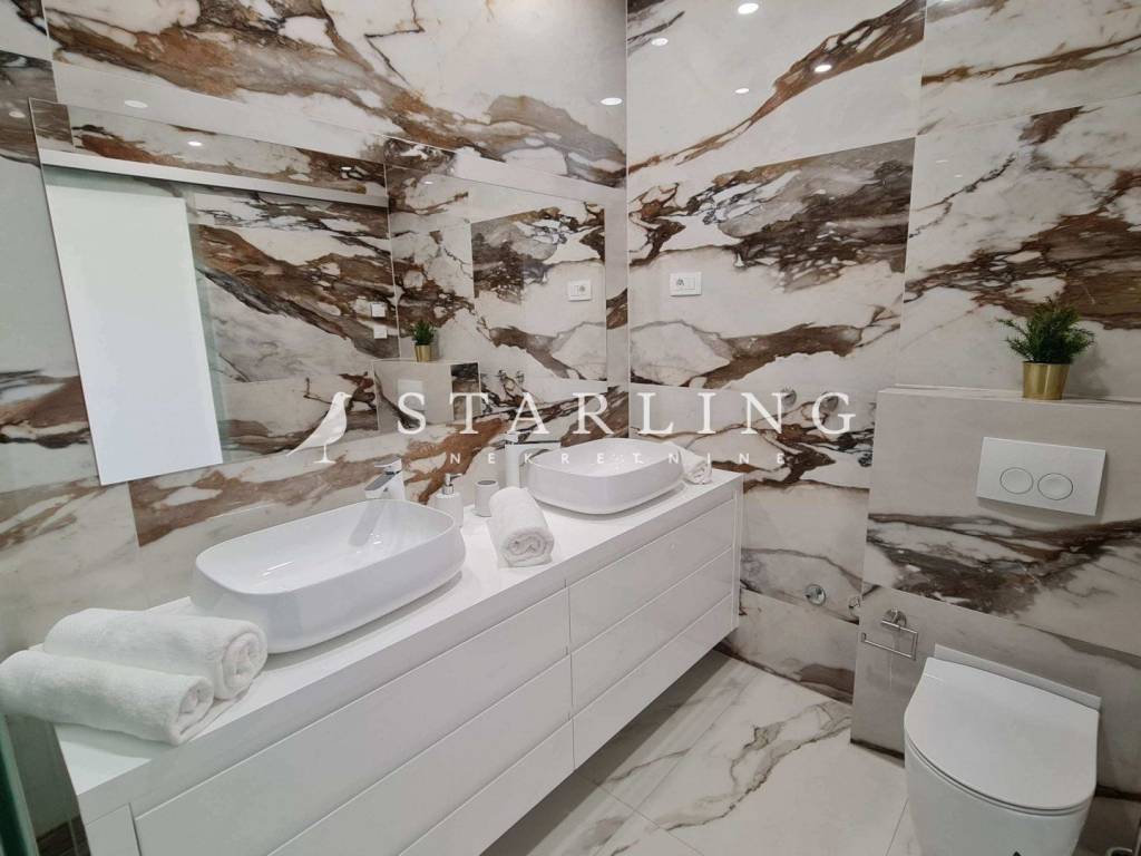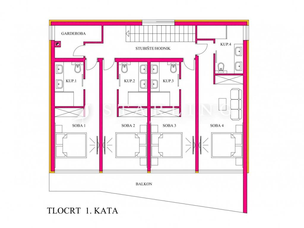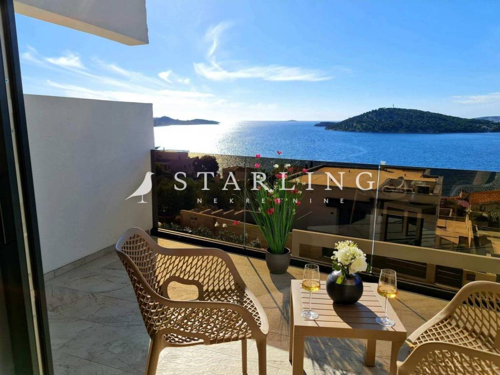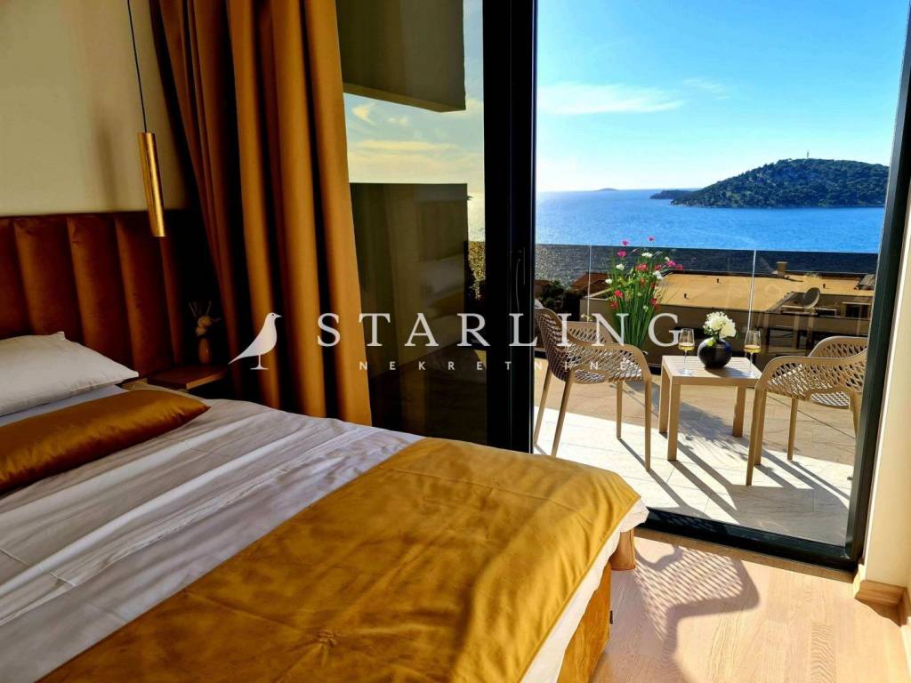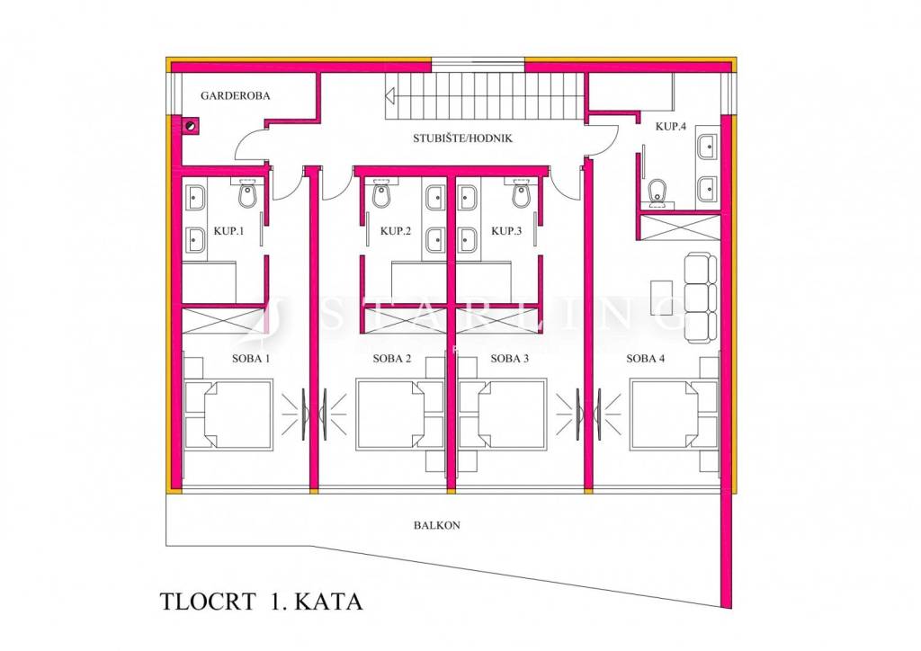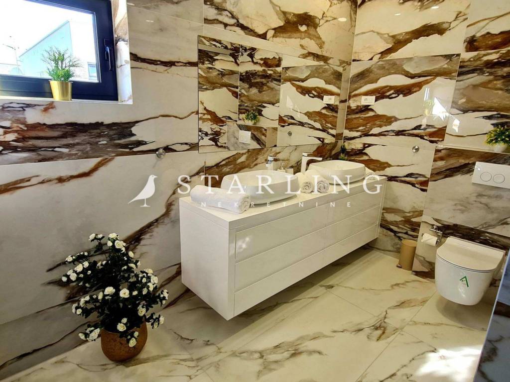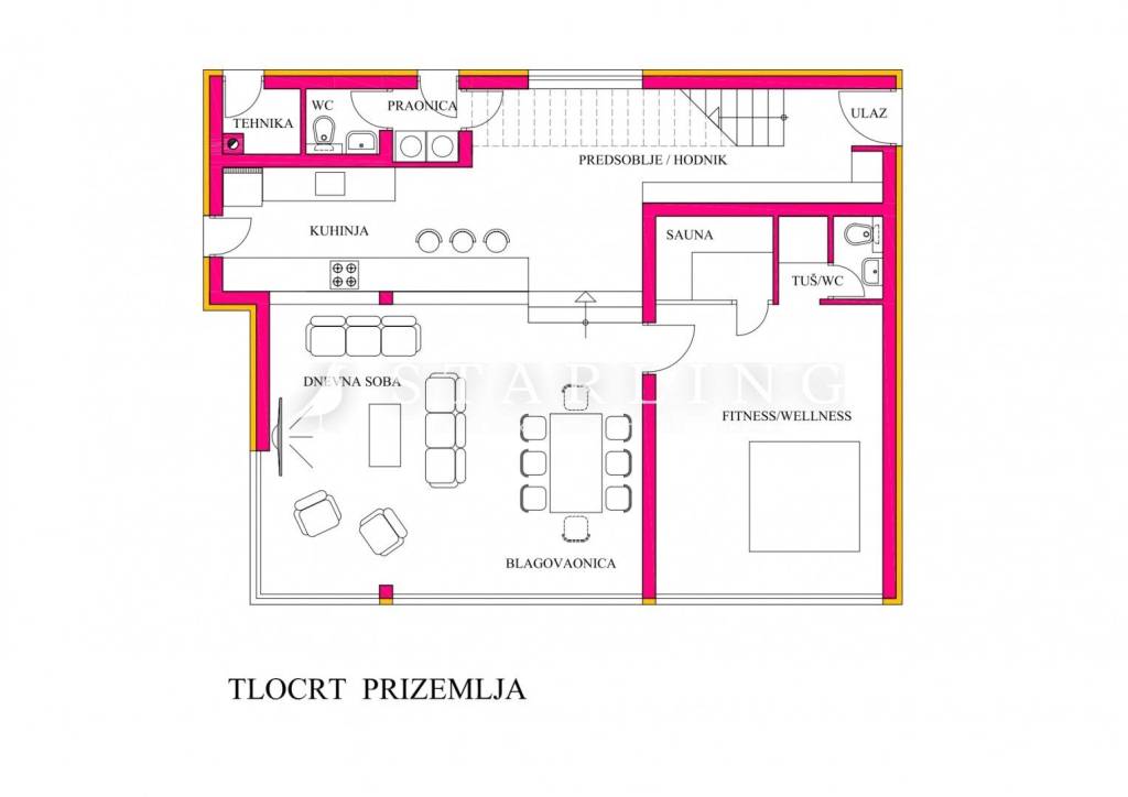 LUXURY VILLA WITH SEA VIEW, FOR SALE, ROGOZNICA, RAŽANJ, 260 m2 This modern villa is located in a row of a luxury complex of 3 sister villas. All three villas have the same concept and design. This villa consists of: GARDEN: heated swimming pool (38 m2), terrace, landscaped lawn and driveway with parking for 3 vehicles. GROUND FLOOR: open-concept kitchen connected to the living room and dining room, bedroom with private bathroom, toilet, sauna with shower, laundry room, storage room, and exit from the living room to the outdoor terrace through a large glass wall. FIRST FLOOR: 4 bedrooms with private bathrooms and wardrobe. Luxury villa, 260 m2, is located in a quiet Dalmatian town near Rogoznica in a closed complex of villas. A combination of modern architecture and natural surroundings with a unique view of one of the most beautiful sunsets that sets directly into the sea, this villa is a hit! Four fully equipped bedrooms with double beds are located on the upper floor with a beautiful view of the sea. Each room has its own private bathroom with toilet. On the ground floor there is a spacious living room, kitchen, dining room and laundry room with a washing machine and dryer, a separate bathroom and a wellness room with a sauna and a hot tub where you can fully indulge in all the pleasures of wellness relaxation with a beautiful view of the sunset. On the large terrace of 140 m2 (110 m2 of teak) there is a heated infinity pool. In addition to heating, the 1.45 m deep and 10 m long pool has a cooling option and includes a children's pool. The location of the villa provides shade and sun throughout the day. There is a parking lot with three parking spaces in the completely fenced yard of the villa. Near the villa there is a pebble beach typical of the Dalmatian coast. The enchanting sea coast hides various specialties that are located in the immediate vicinity of the villa. One such place is Zmajevo oko, a small salt lake located on the Gradina peninsula near Marina Frapa. A little further away is hidden Plava uvala, perfect for idyllic afternoons in the company of loved ones. If you want to rent a boat or reach the villa with your own boat, you have a private mooring at the nearby Frapa Marina. In a position that ensures complete privacy and peace, not far from the villa there are various amenities such as bars, restaurants, shops, etc. For all those who prefer sightseeing and exploring cultural and historical monuments, the historical cities of Šibenik in the north and Split in the to the south. Orientation: North - South Built: 2019 Parking: 3 places Price: 1,550,000 EUR