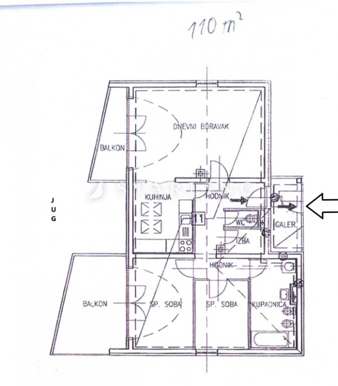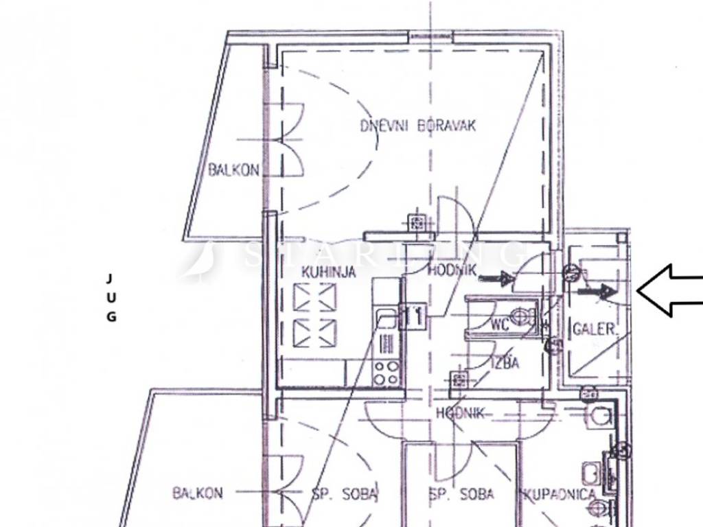 Prostor se sastoji od 3 prostorije, kupaonice, wc-a, spremišta i dva balkona.