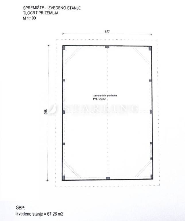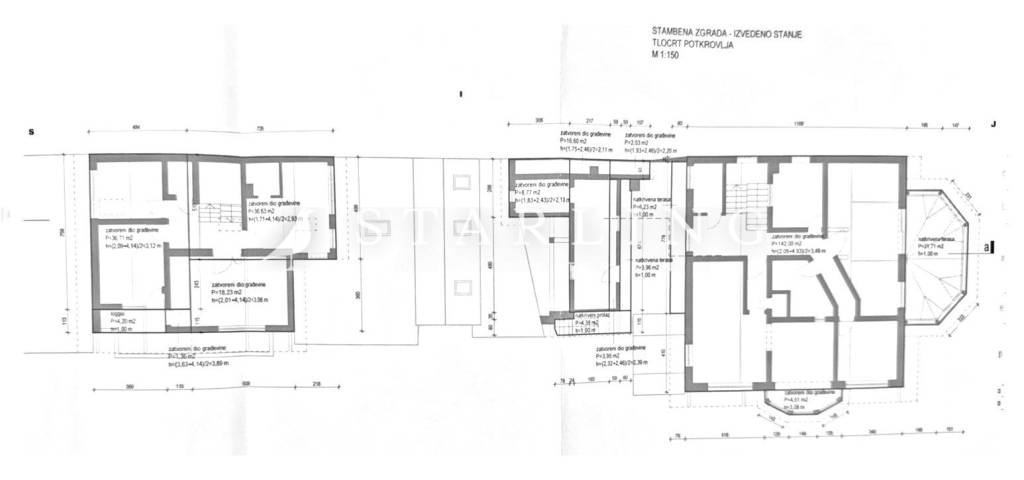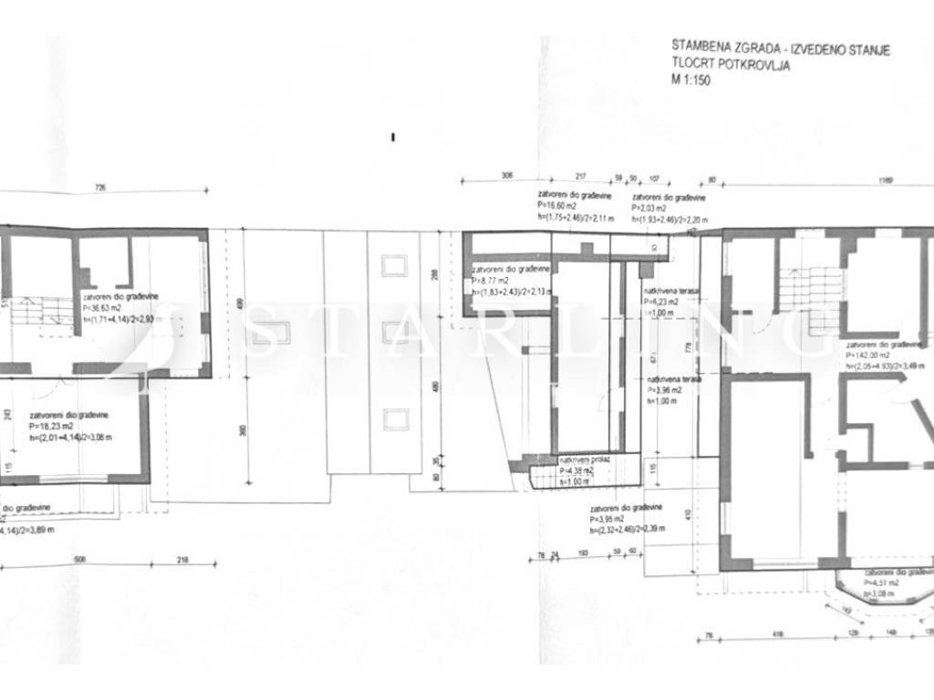 Na prostranoj parceli se nalazi stambena zgrada površine 454 m2 a sastoji se od 22 soba, 2 kuhinje, 5 kupaonica, 3 zasebna wc-a, 4 terase, 1 balkona i 7 hodnika.