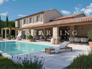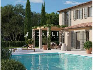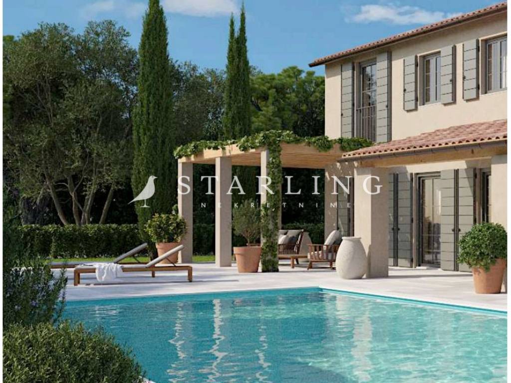The villa is designed as a blend of modern architecture and the traditional Mediterranean style with simple lines, constructed using modern and traditional materials such as stone, wood, and concrete.