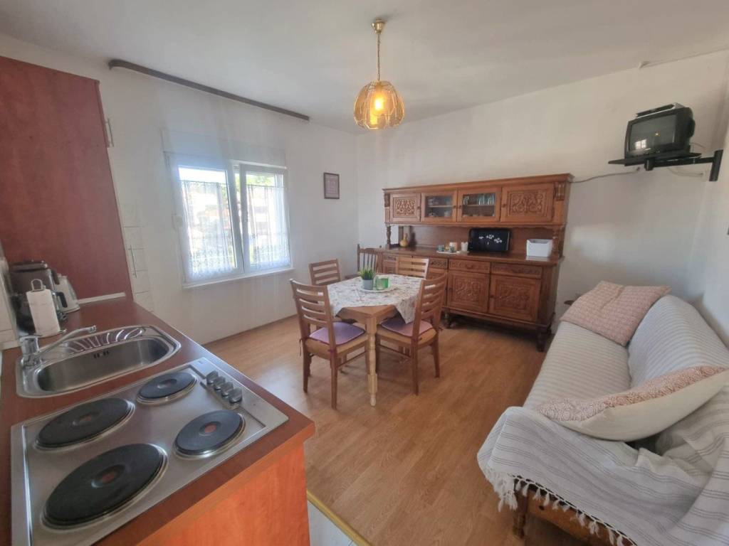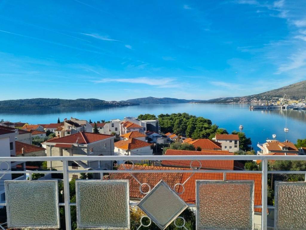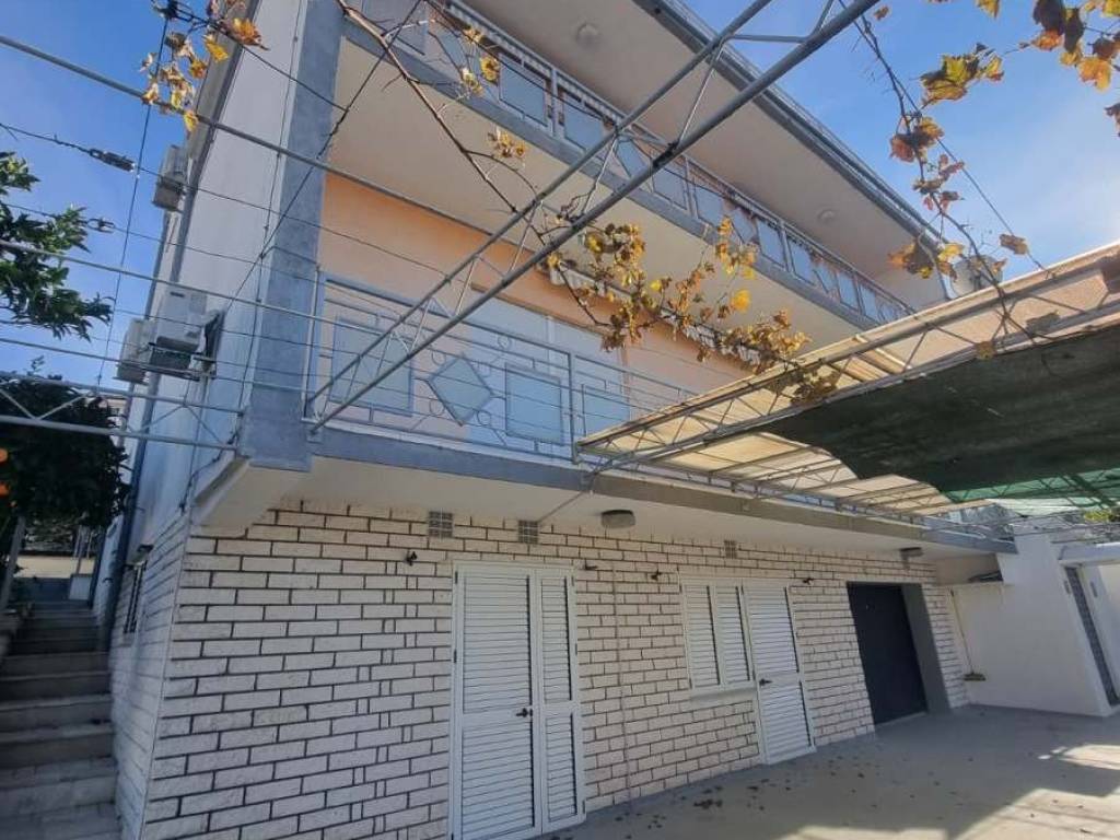 Situated in an exceptional and peaceful location in the immediate vicinity of the sea, this impressive detached apartment house represents a rare opportunity on the market due to its size, layout, and breathtaking view.The property is built on a 700 m² plot and has a total gross floor area of 572.98 m². It extends over four floors: basement, ground floor, first floor, and second floor, all connected by an internal staircase. The house contains four residential units, one on each floor, while the basement additionally includes a garage and storage room.Basement:The basement features a functional residential unit with a surface area of 40.49 m², consisting of a living room, kitchen with dining area, bathroom, and two storage rooms. On the same floor, there is also a garage of 21.50 m² and an additional storage room of 5.28 m².Ground Floor:Accessed by the staircase and with the appearance of a higher floor, the ground floor consists of a spacious apartment with a total area of 127.63 m². It includes a living room, kitchen and dining area, hallway, four bedrooms, two bathrooms, two storage rooms, and access to a balcony.First Floor:The first floor accommodates an apartment of a similar layout, with a total area of 121.96 m². It consists of living room, kitchen with dining area, hallway, four bedrooms, a bathroom, a storage room, and a balcony.Second Floor:The second and top floor features an apartment with a surface area of 62.15 m², consisting of a living room, kitchen and dining area, hallway, two bedrooms, and a bathroom. A special highlight of this floor is the spacious terrace of 67.48 m², offering a magnificent panoramic view of the sea and the surrounding area. The west-facing orientation of the house ensures plenty of natural light throughout the day and unforgettable sunsets.Outdoor Area:The fenced and beautifully landscaped yard offers a barbecue, an area for socializing and outdoor dining, and enough parking space for several vehicles. There is also a garden planted with olive trees and citrus fruit.The property is well maintained, fully furnished, and equipped, and is being sold as such. Its high-quality older construction offers excellent potential for modernization and customization according to personal preferences.In addition to being suitable for family living, the house represents a secure and long-term profitable investment for tourist rental.It is located in a quiet and desirable area, close to all essential amenities for everyday life, while the sea and beach are only 200 meters away. The center of Trogir is 2 km away, Split Airport is 7 km away, and the Split city center is 30 km away.