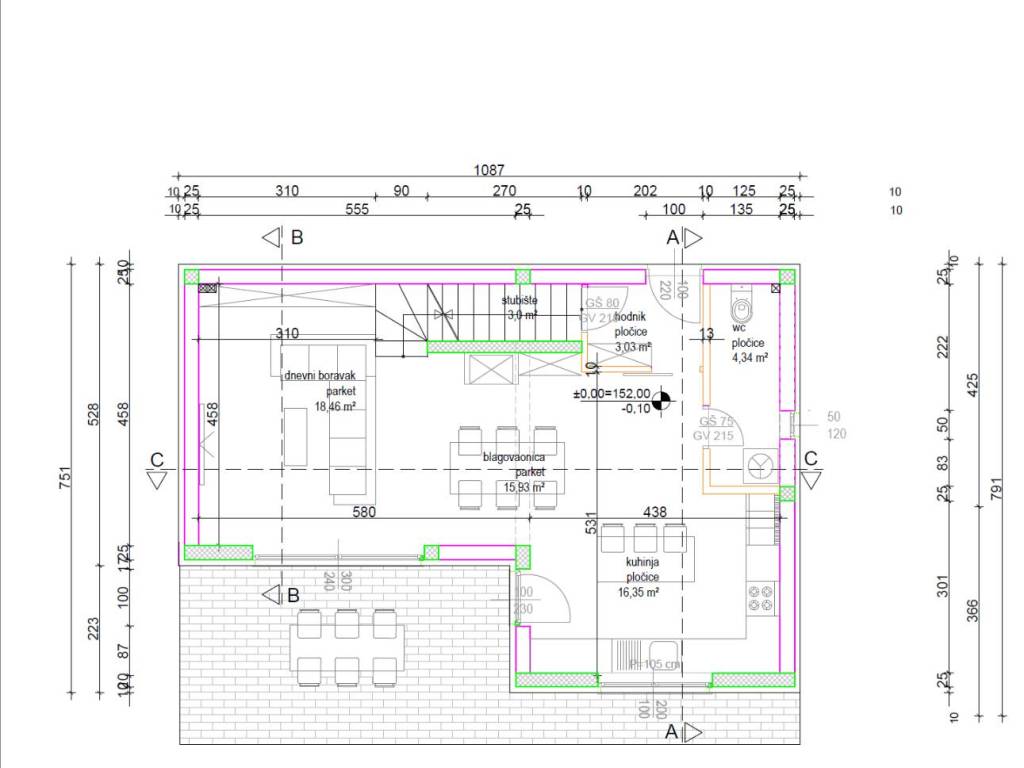 This newly built, three-bedroom detached house in Poljica, near Marina, is for sale. It sits on a 310 m² plot and offers 109 m² of living space spread over the ground and upper floors.The ground floor features an open-plan kitchen, dining, and living area, as well as a guest toilet. The kitchen and living area provide access to the terrace. An internal staircase leads to the upper floor, which includes two bedrooms and two bathrooms.The builder has largely completed the facade and exterior work. Interior finishing can be customized to the future owners' preferences and is not included in the price. There is also the option to add a swimming pool.The house includes two parking spaces and faces west.Distances: 200 m beeline to the sea - 4 km to Marina - 10 km to the old town of Trogir - 16 km to Split Airport