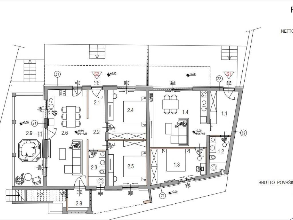 The apartment covers an area of 104 m2 and consists of an entrance with a hallway, two bedrooms of 15 and 17 m2, a bathroom of 5m2, a kitchen with a dining room and living room of 35 m2 and an outdoor covered terrace of 13m2. The apartment has access to an outdoor uncovered terrace, storage room of 5 m2 and a parking space.