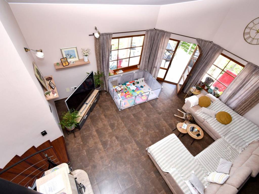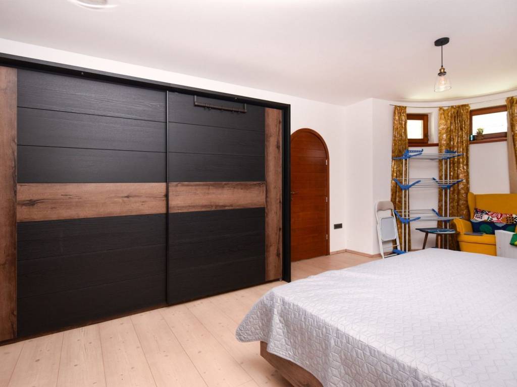 The entire living space has underfloor heating that can work via a wood-burning fireplace in the main living room or via electricity via a heat pump, with the help of solar collectors that primarily heat sanitary water.
