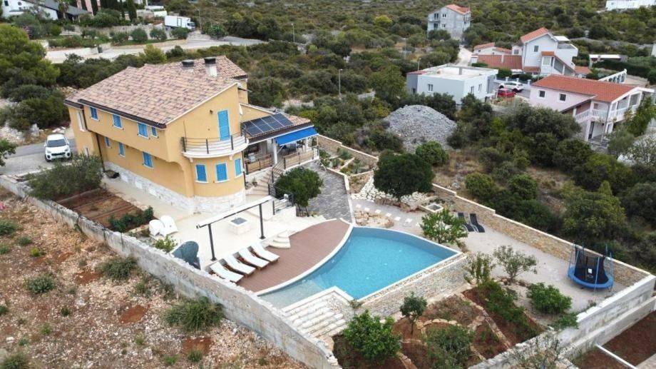 For sale is a special villa with a swimming pool, in a quiet part of Brodarica. The villa has a basement, a ground floor and a first floor with a gallery. There are five bedrooms, two of which have their own bathroom, three modern living rooms with kitchen and dining room, and a total of four bathrooms and two toilets. The special feature is that one living room has a fireplace and a professional pizza oven (bread oven) and is the most beautiful space you can choose for hanging out with family and friends.