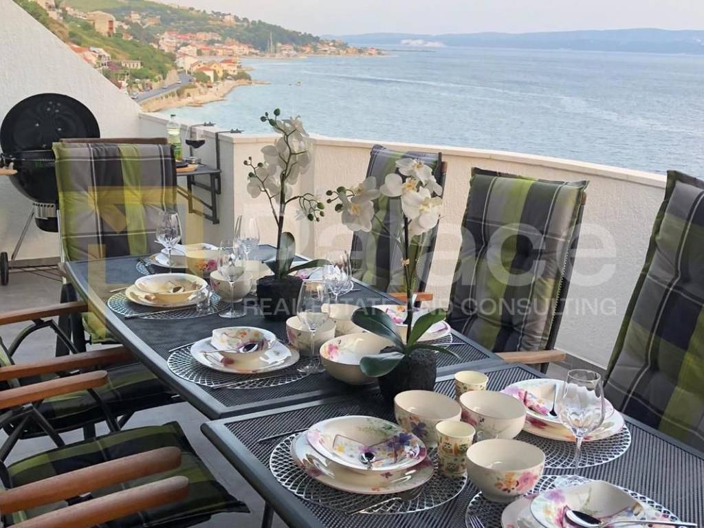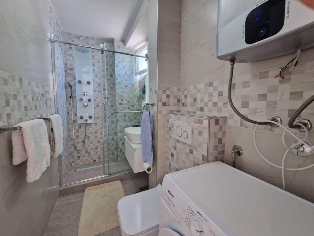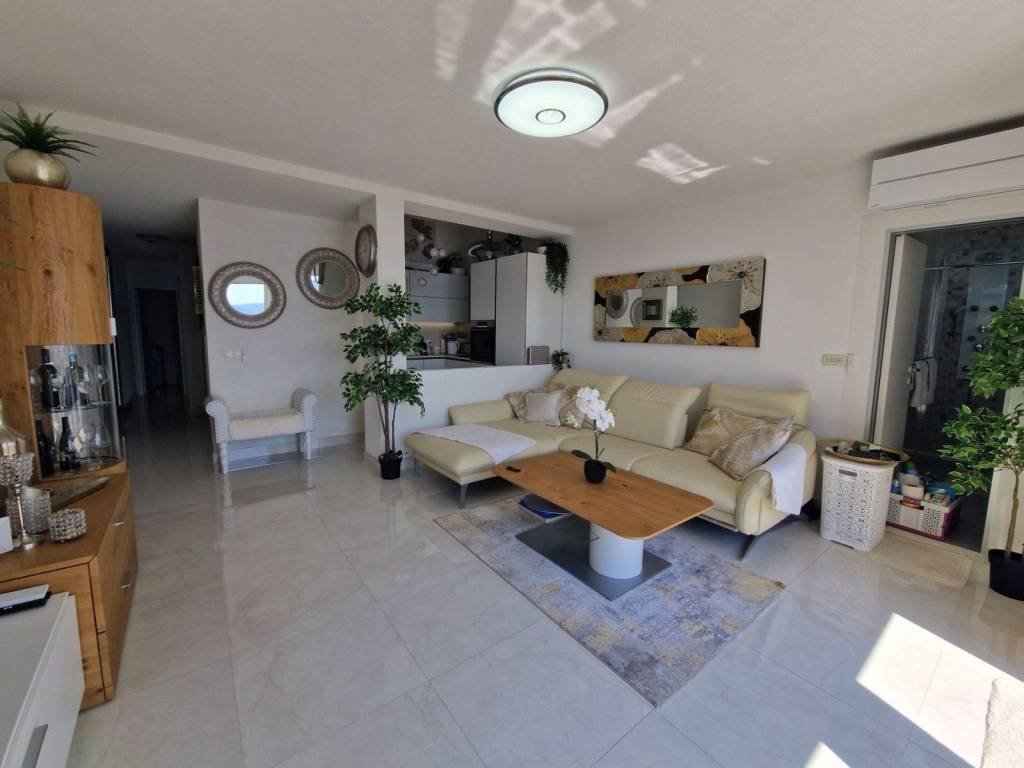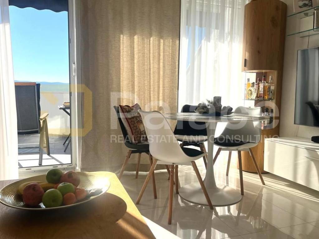 The penthouse consists of two bedrooms, a kitchen with a large airy living room, one bathroom, a separate toilet, and a terrace area of 20m² with an open sea view and nearby islands, as well as a storage room with a total area of 4.5 m².It is furnished with modern luxury furniture, however, some of the furniture is not included in the price of the apartment.