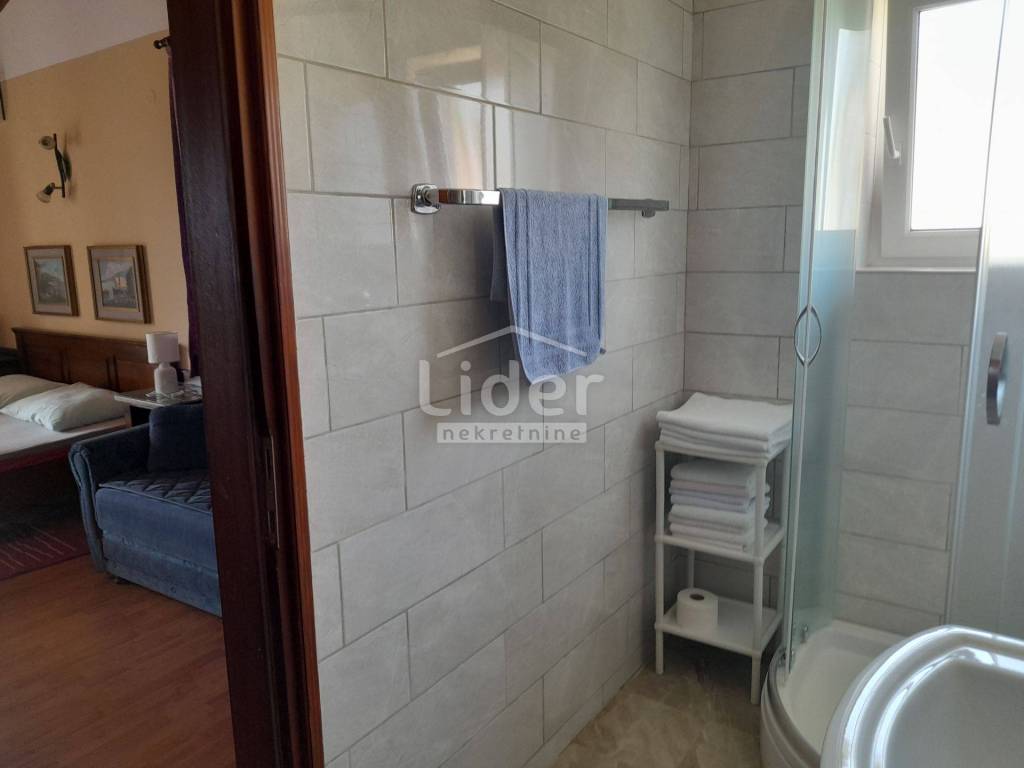 On the ground floor there are two apartments with a terrace, separate kitchen and dining room. In the outer part there is a summer kitchen, a garage for two cars, and several parking spaces. On the first floor there is an apartment consisting of a large living room with a kitchen and dining room, and two bedrooms with balconies, a bathroom, a hallway and a toilet. On the second floor there are five bedrooms with bathrooms and balconies, and a view of the sea. On the third floor there are three bedrooms with bathrooms and balconies. The first two floors have oil central heating, while the second two floors have air conditioners. Solar panels on the roof for hot water.