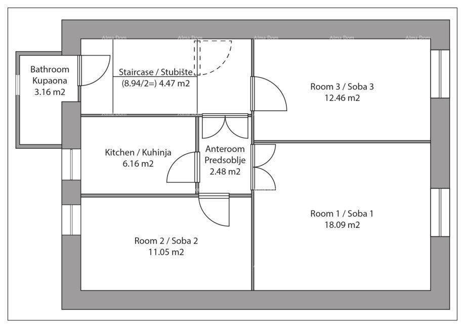 For sale: an apartment with an area of 62.7 m², located on the 2nd floor (top floor) of a residential building in Poreč. The apartment consists of: - Three separate bedrooms - Kitchen - Bathroom - Hallway - Staircase. The apartment currently does not have a living room; one of the bedrooms can easily be converted into a living space, depending on the needs of the future owner. Features and benefits: - Ideal for renting to seasonal workers or for accommodating your own employees. - Possibility of conversion into a tourist apartment. - The building shares an entrance with only one other apartment. Excellent location – close to all city amenities. For additional information, please contact: Azra: +385 91 611 5706 +385 98 420 885 azra@almadominvest.com
