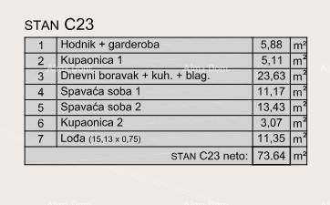 Luxury apartments with a view of Marina Veruda!Apartment C23, with an area of 73.64 m2, is located in building C.The apartment is located on the 3rd floor of the building and consists of a hallway with a wardrobe, a living room with a kitchen and a dining room, 2 bedrooms, 2 bathrooms and a loggia.The apartments are sold on a "turnkey" basis with a fully furnished bathroom (furniture and sanitary ware), flooring in all rooms (1st class ceramics, laminate), with electrical installations, built-in air conditioning, interior joinery, exterior PVC or ALU joinery, burglar-proof and fire-resistant entrance doors, antenna system, UTP network, and white walls and ceilings.A garage space and a storage room of 3.2 m2 can be purchased with the apartment, which are charged additionally.The price of the garage space is 35,000 euros.Note: VAT is included in the price.For further information, please contact:Azra+385 91 6115706+385 98 420885azra@almadominvest.com