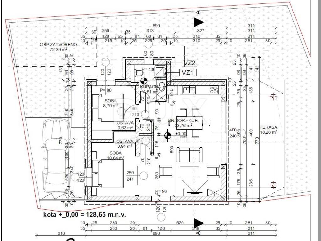 The indoor space is connected to an outdoor covered terrace measuring 22m, covered with stone and covered with a roof, which allows use in all weather conditions.