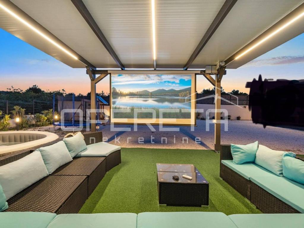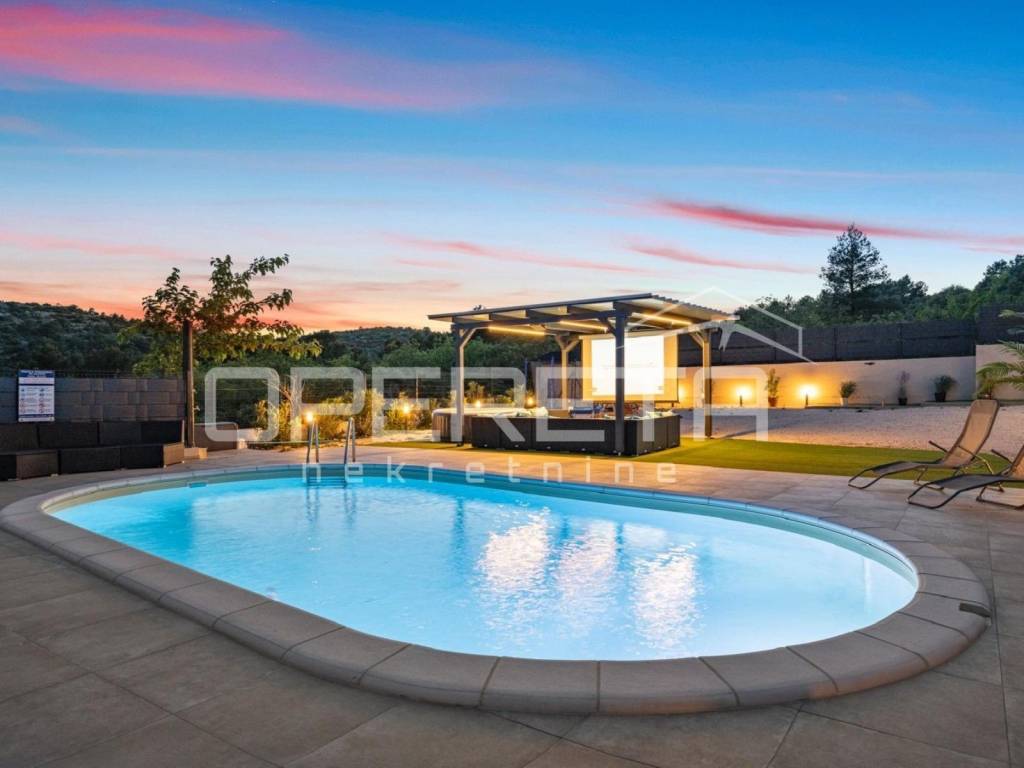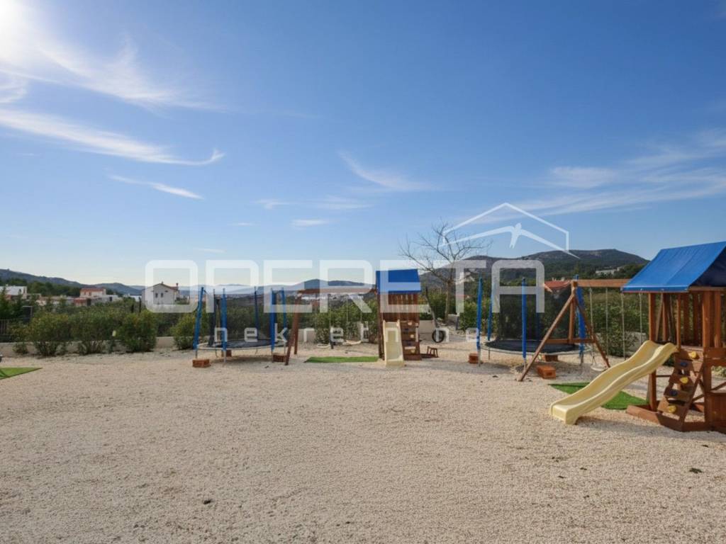 Zemljište je projektirano na dvije kaskadne razine, funkcionalno i vizualno odvojene modernim potpornim zidovima i ogradom. Donji dio parcele sadrži prostranu i praktičnu kontejner-garažu, idealnu za smještaj vozila, brodice ili dodatnog skladišnog prostora. Na gornjem dijelu parcele smjestio se bazen sa sunčalištem, natkrivena terasa te dječje igralište, sve okruženo mediteranskim biljem i oplemenjeno dekorativnim šljunkom.