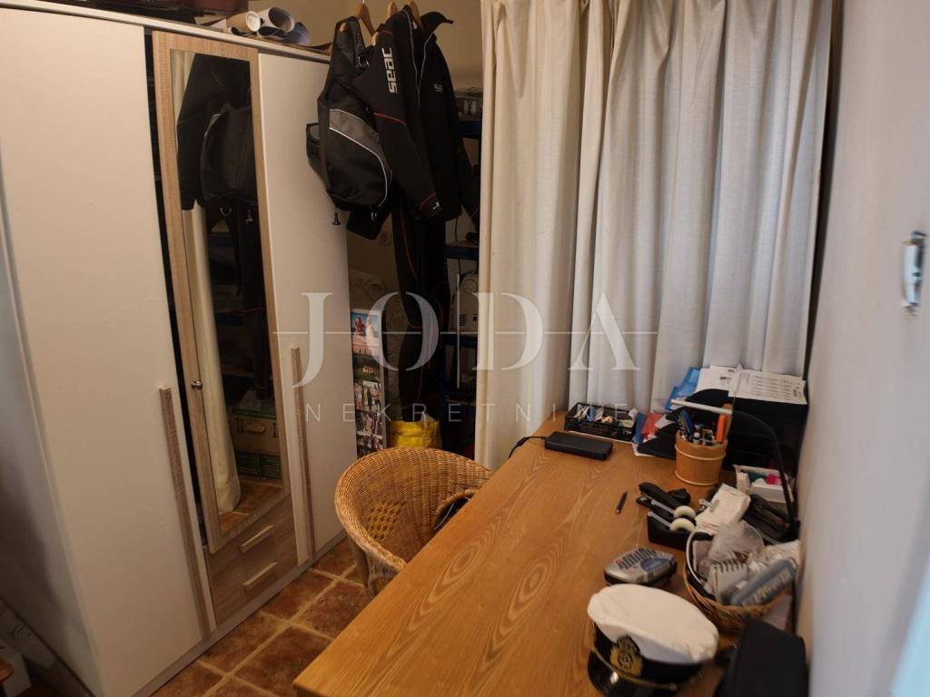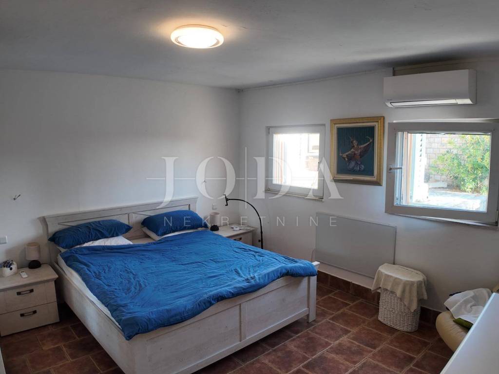 The house is spread over two floors, ground floor and first floor. The ground floor has a spacious living room with access to a terrace with an open view of the sea, two bedrooms, a bathroom and a small work area. The kitchen is designed as a separate, closed summer kitchen, since the ground floor was primarily used during the summer months. All necessary installations for the kitchen have already been carried out, which allows for easy relocation of the kitchen to the interior of the house.