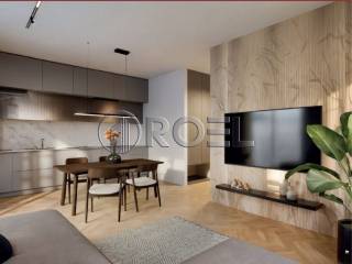The floors will be covered with parquet and ceramics, and underfloor heating with heat pumps has been implemented throughout the apartment. Anthracite-colored PVC joinery with triple-glazed windows contributes to a modern aesthetic impression and ensures excellent thermal and sound insulation. In combination with other equipment and construction methods, all together contribute to the building's high energy efficiency and favorable monthly utilities.