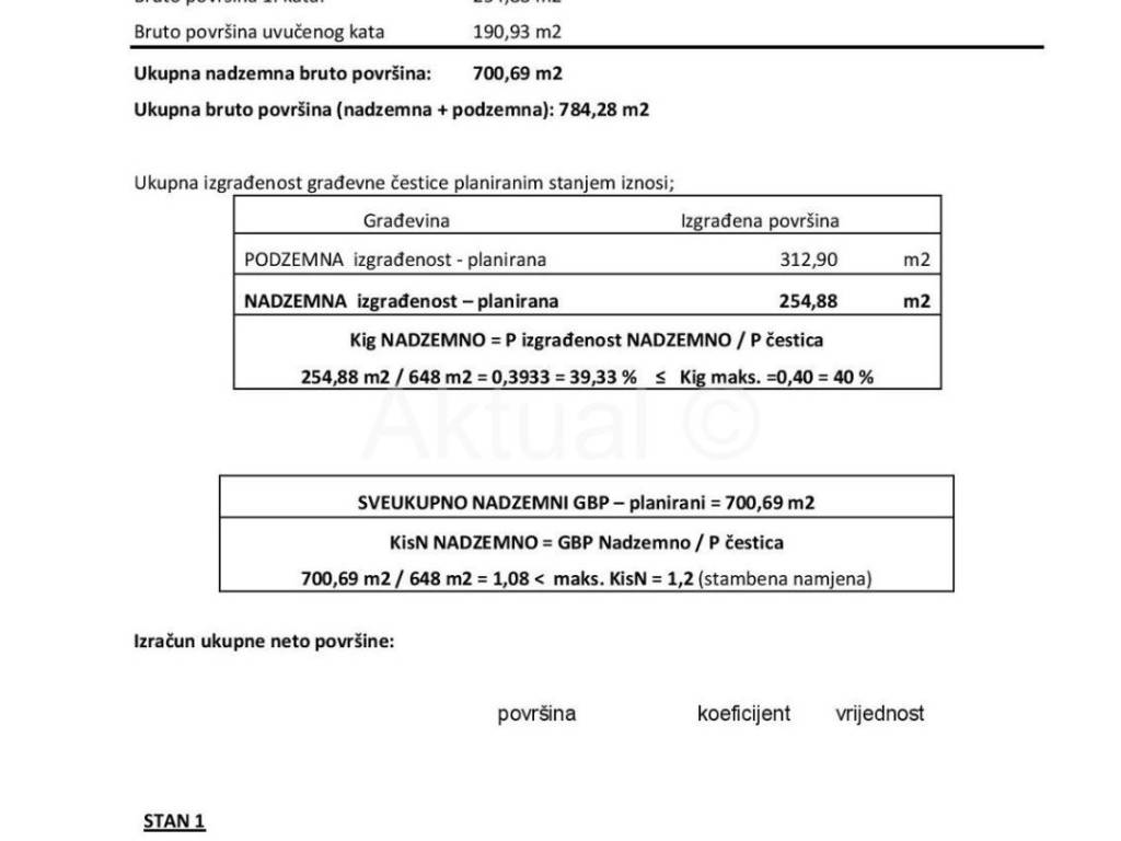 Zgrada će imati podzemnu garažu i 11 stanova na ukupno 4 etaže (Po+ P + 1 + UVk). Podzemna bruto površina je 83.59 m2, nadzemna je 700.69 m2; a ukupna građevinska bruto površina iznosi 784.28 m2.